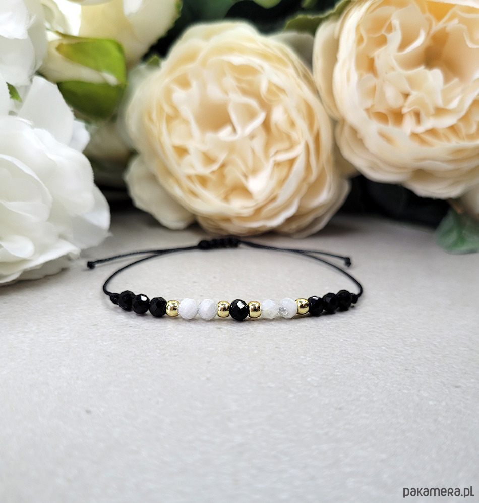 Przepiękna delikatna bransoletka zrobiona z kamieni naturalnych: Turmalinu, Spinelu, Kamienia księżycowego, Hematytu w kolorze złota.