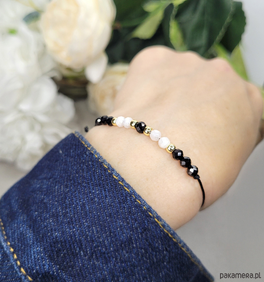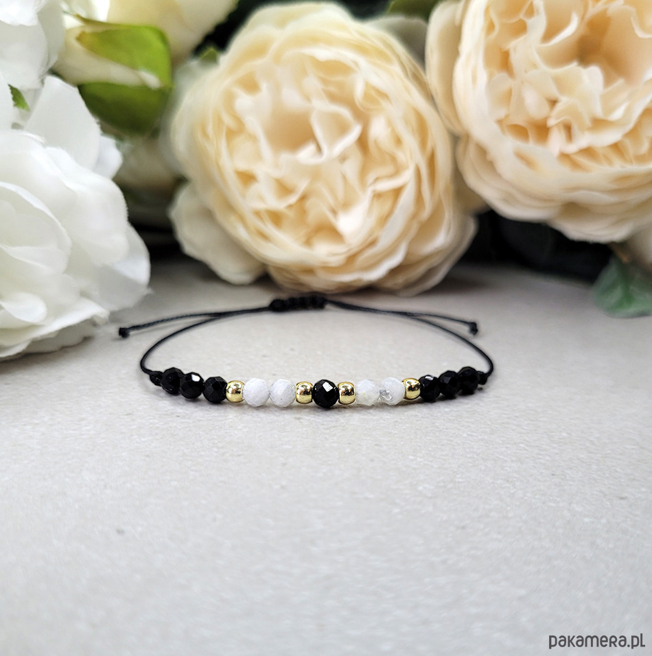 Przepiękna delikatna bransoletka zrobiona z kamieni naturalnych: Turmalinu, Spinelu, Kamienia księżycowego, Hematytu w kolorze złota.