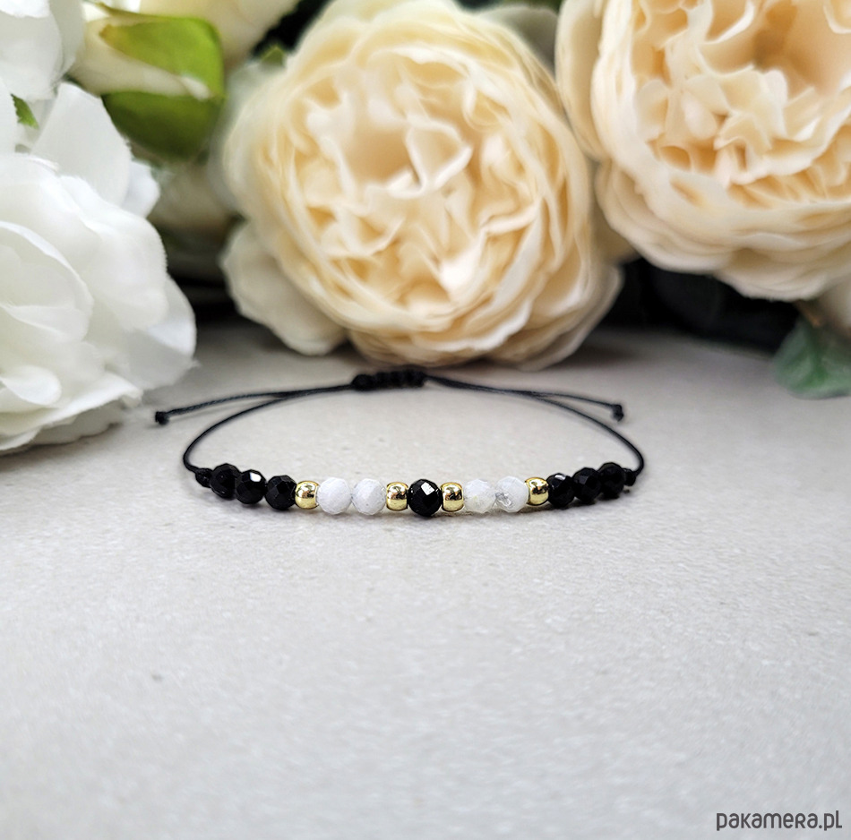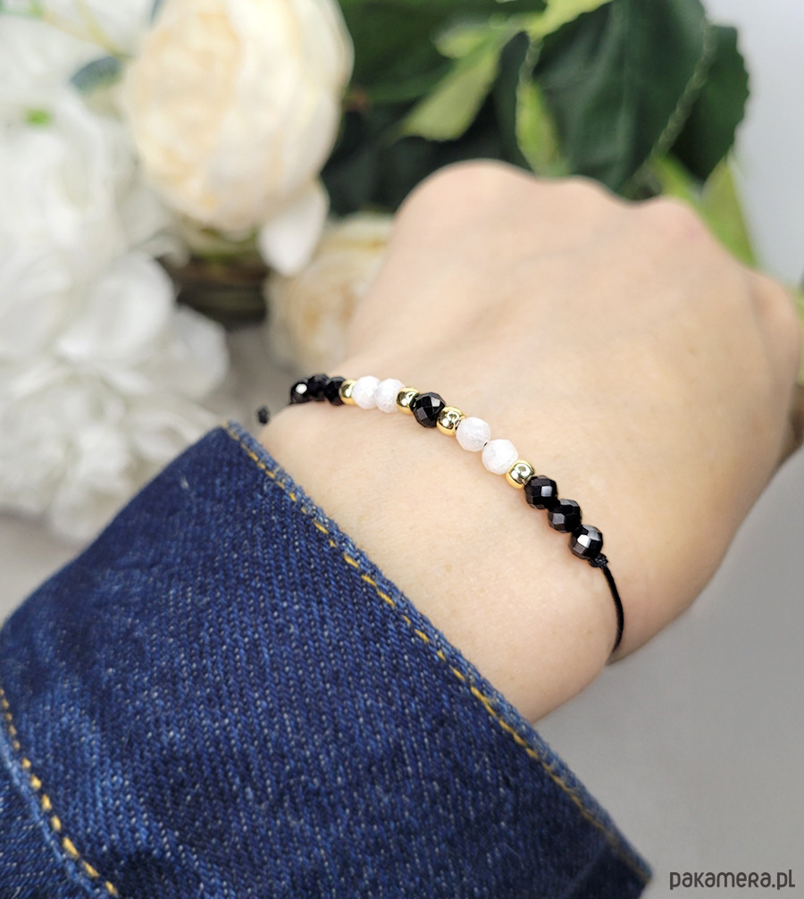Przepiękna delikatna bransoletka zrobiona z kamieni naturalnych: Turmalinu, Spinelu, Kamienia księżycowego, Hematytu w kolorze złota.