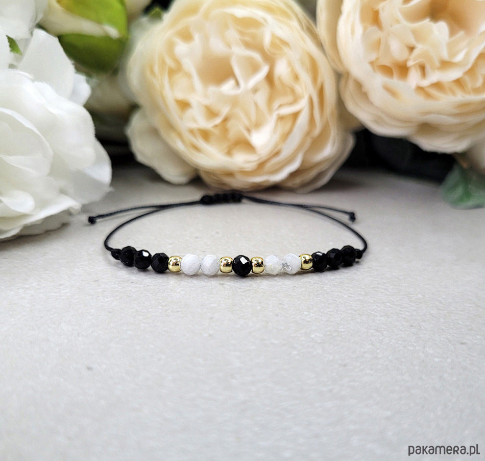 Przepiękna delikatna bransoletka zrobiona z kamieni naturalnych: Turmalinu, Spinelu, Kamienia księżycowego, Hematytu w kolorze złota.