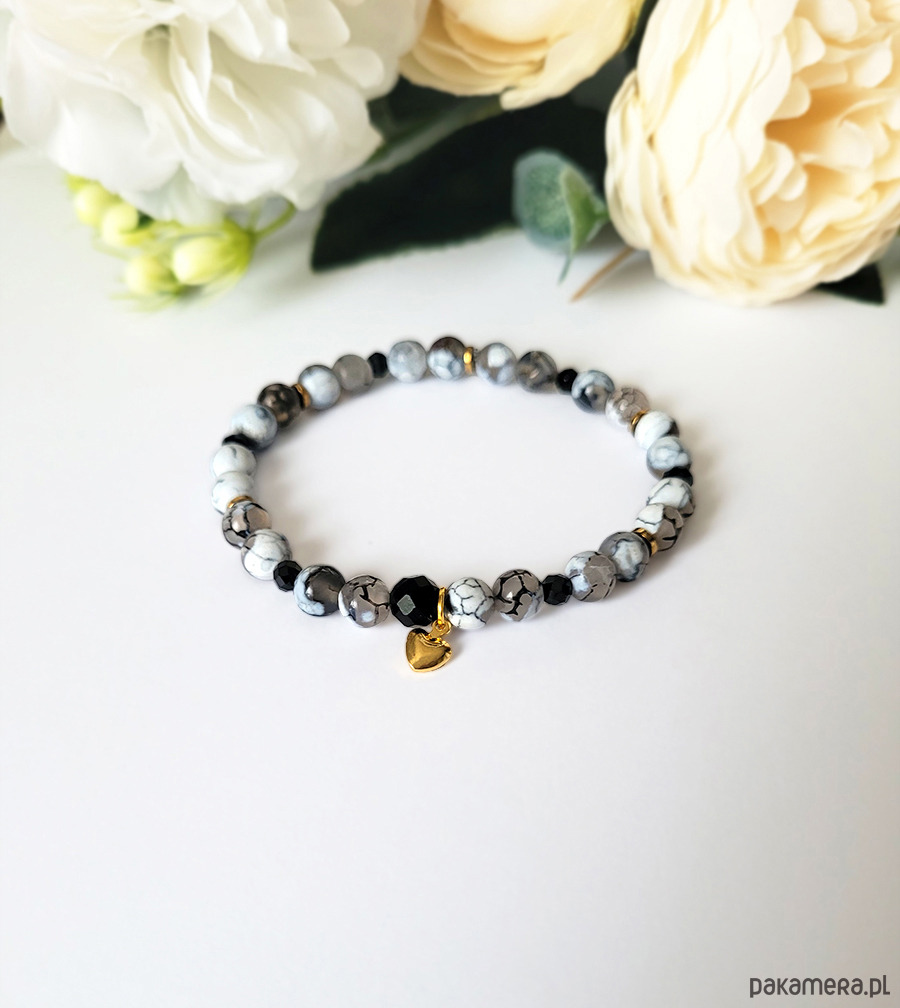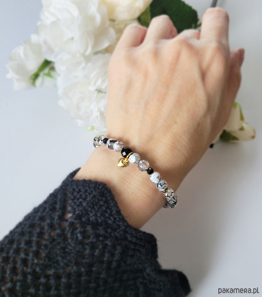 Piękna bransoletka z kamieni naturalnych: Turmalinu, Agatu, Spinelu oraz Hematytu w kolorze złota.