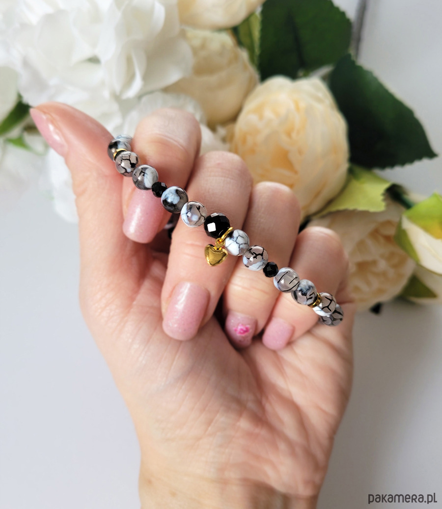 Bransoletka na gumce o wewnętrznym obwodzie ok. 16,5cm. Na zdjęciu na nadgarstku o obw. ok 15cm. Jeśli potrzebny inny rozmiar proszę o wiadomość.