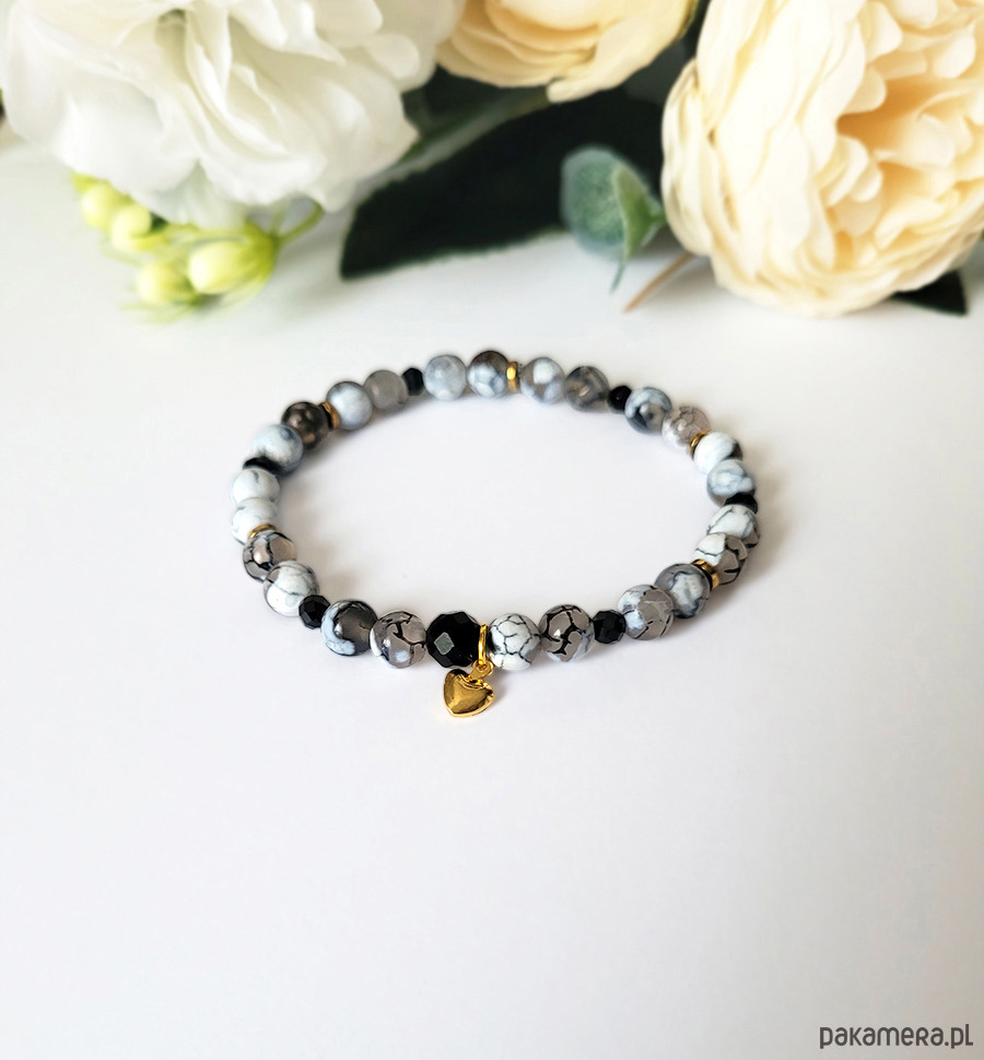 Piękna bransoletka z kamieni naturalnych: Turmalinu, Agatu, Spinelu oraz Hematytu w kolorze złota.