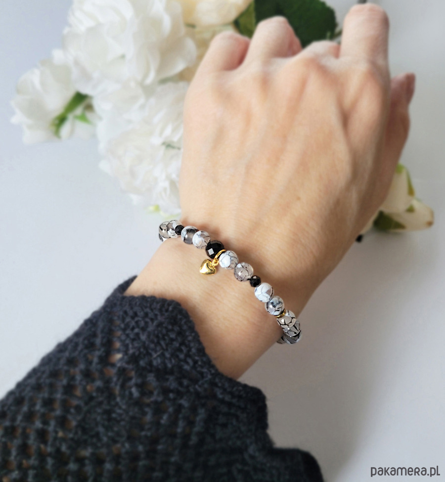 Bransoletka na gumce o wewnętrznym obwodzie ok. 16,5cm. Na zdjęciu na nadgarstku o obw. ok 15cm. Jeśli potrzebny inny rozmiar proszę o wiadomość.