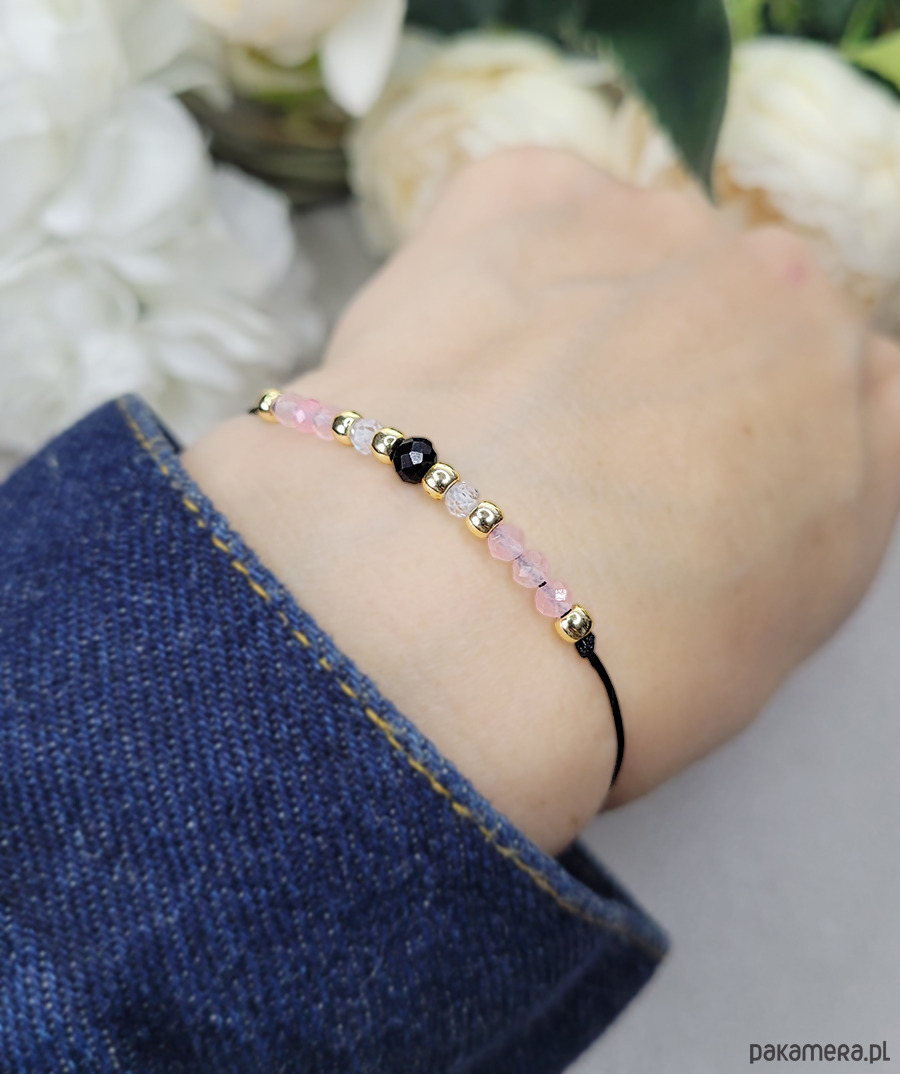 Przepiękna delikatna bransoletka zrobiona z kamieni naturalnych: Turmalinu, Kwarcu różowego, Spinelu i Hematytu w kolorze złota.