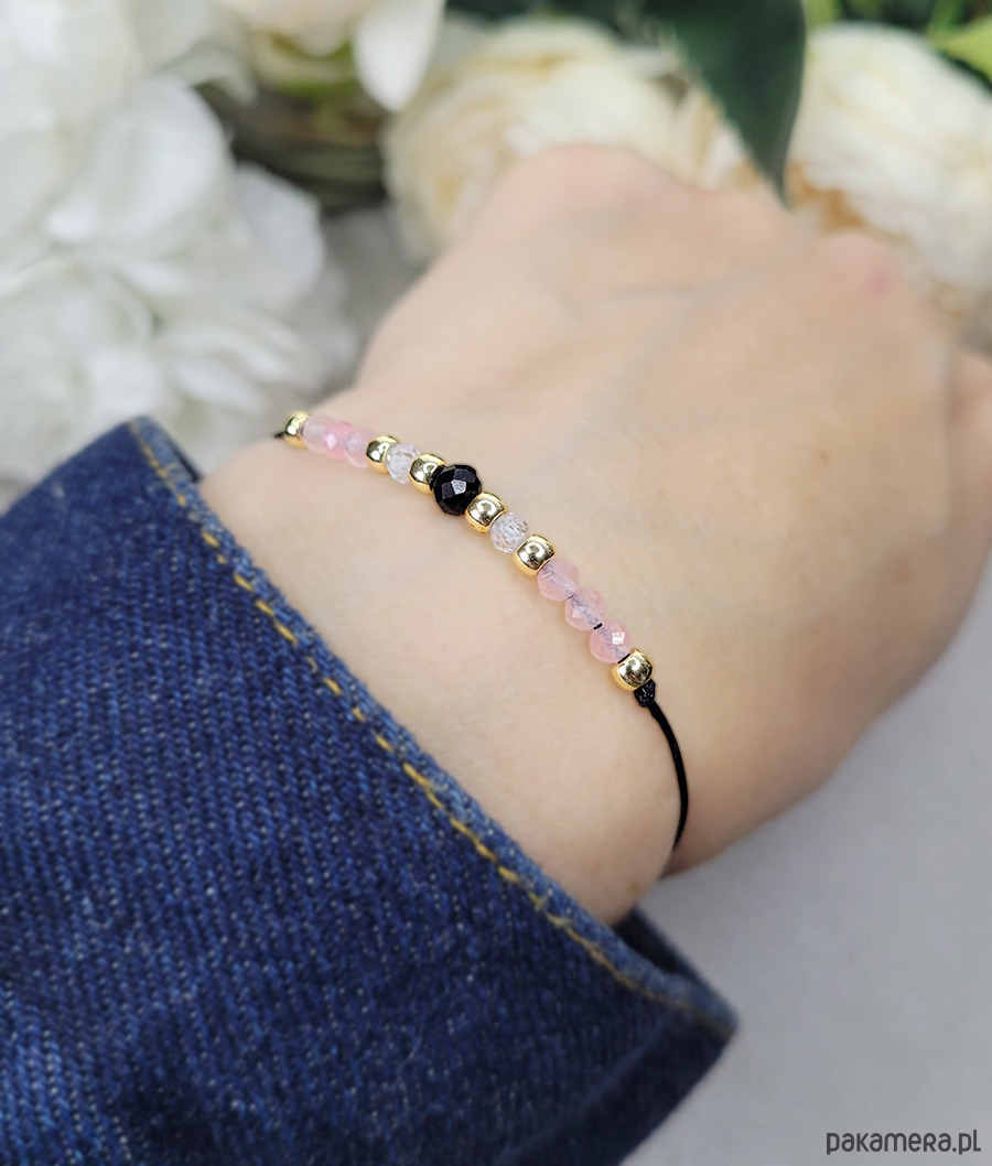 Przepiękna delikatna bransoletka zrobiona z kamieni naturalnych: Turmalinu, Kwarcu różowego, Spinelu i Hematytu w kolorze złota.