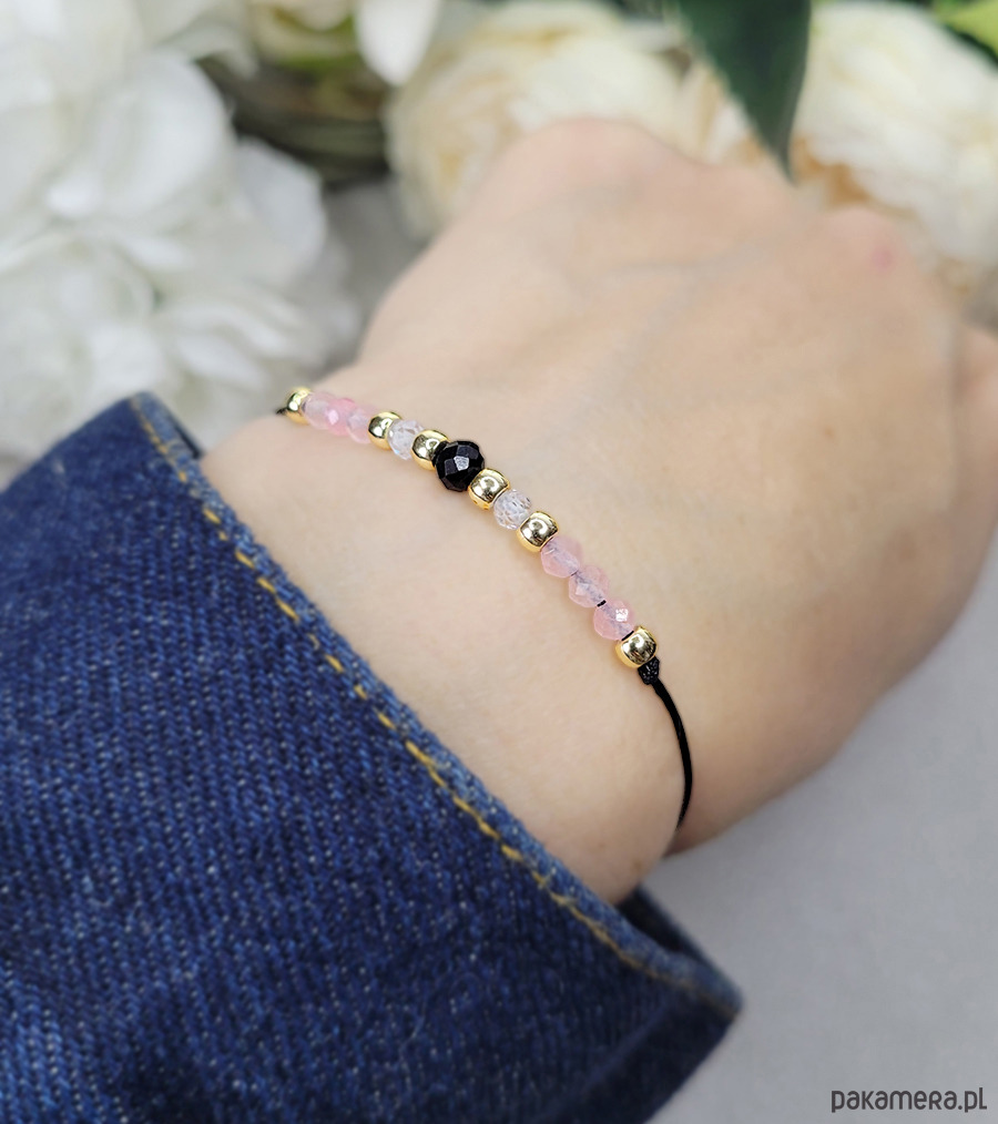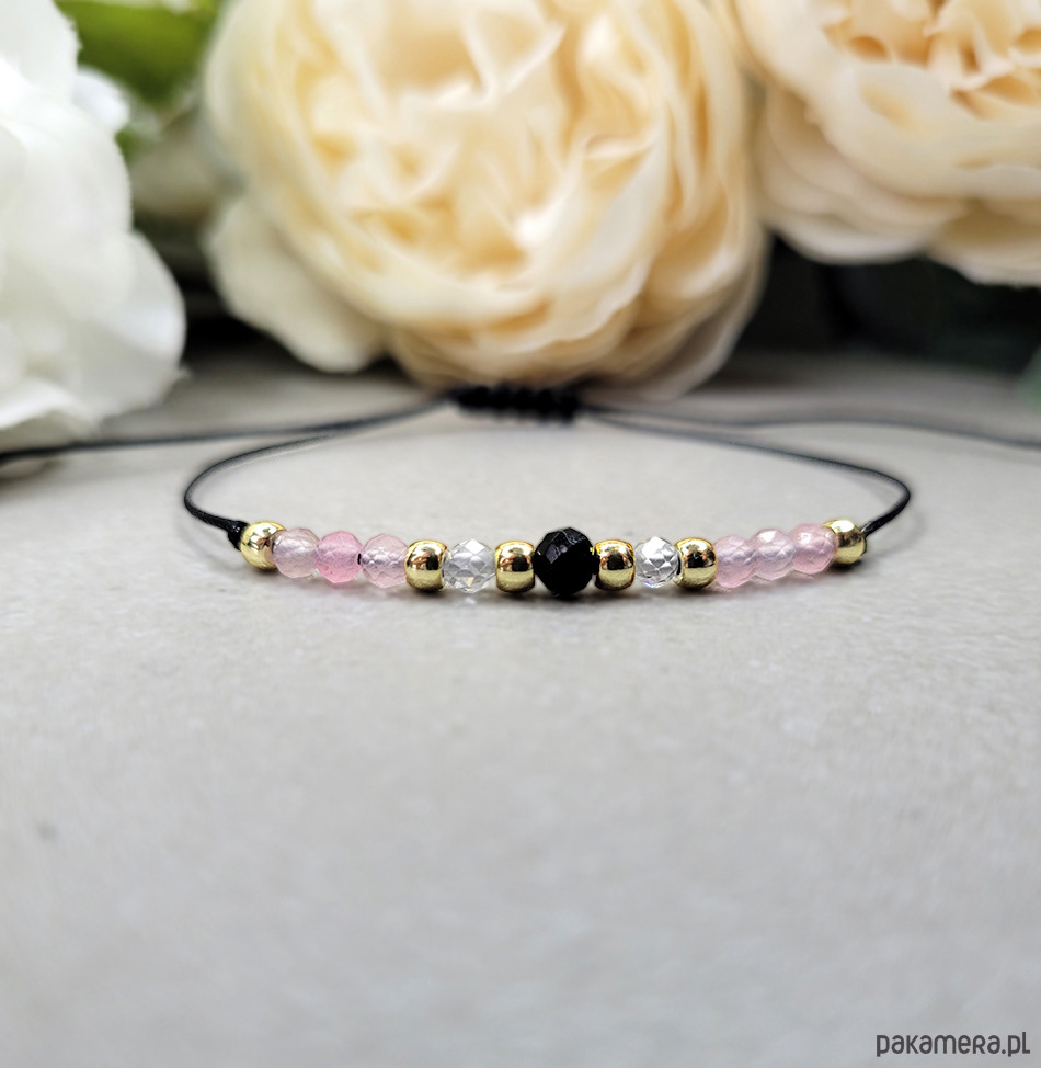 Przepiękna delikatna bransoletka zrobiona z kamieni naturalnych: Turmalinu, Kwarcu różowego, Spinelu i Hematytu w kolorze złota.