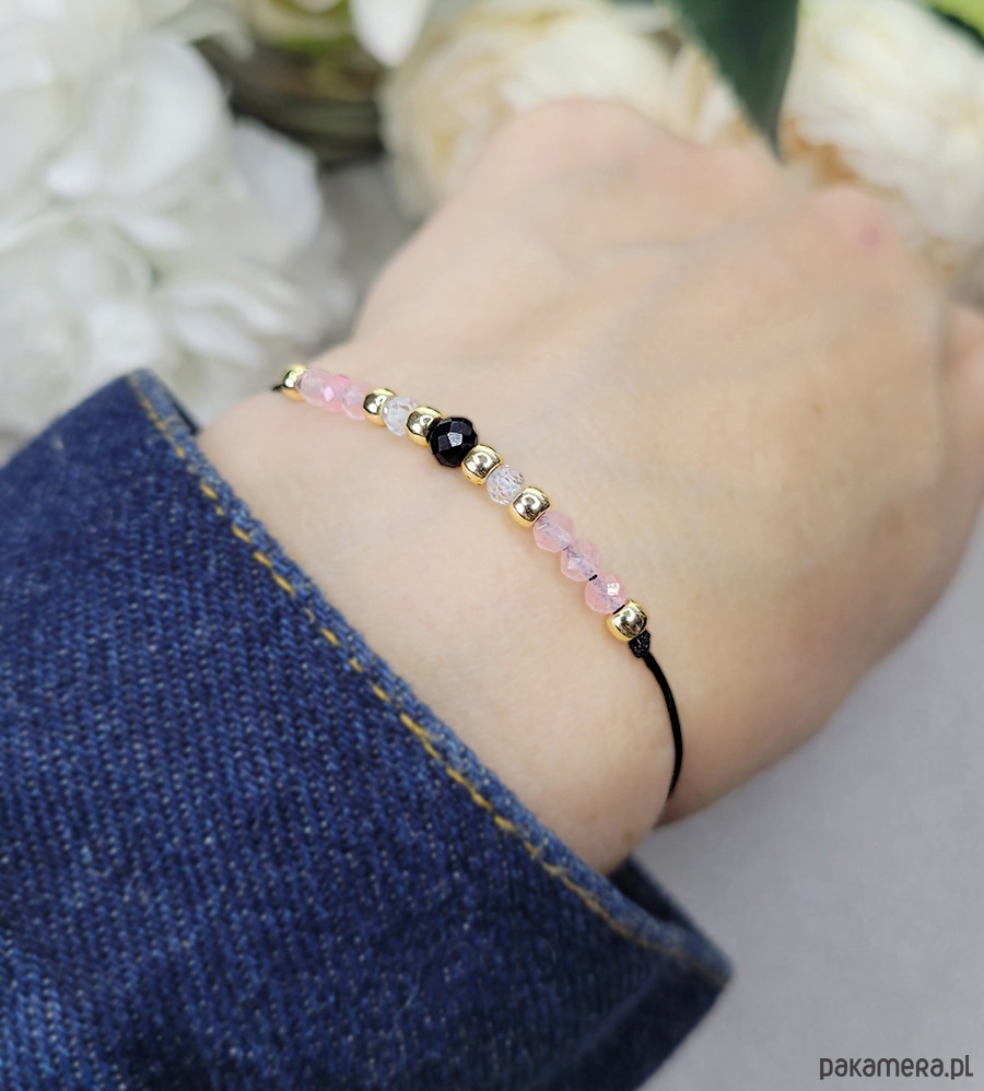 Przepiękna delikatna bransoletka zrobiona z kamieni naturalnych: Turmalinu, Kwarcu różowego, Spinelu i Hematytu w kolorze złota.