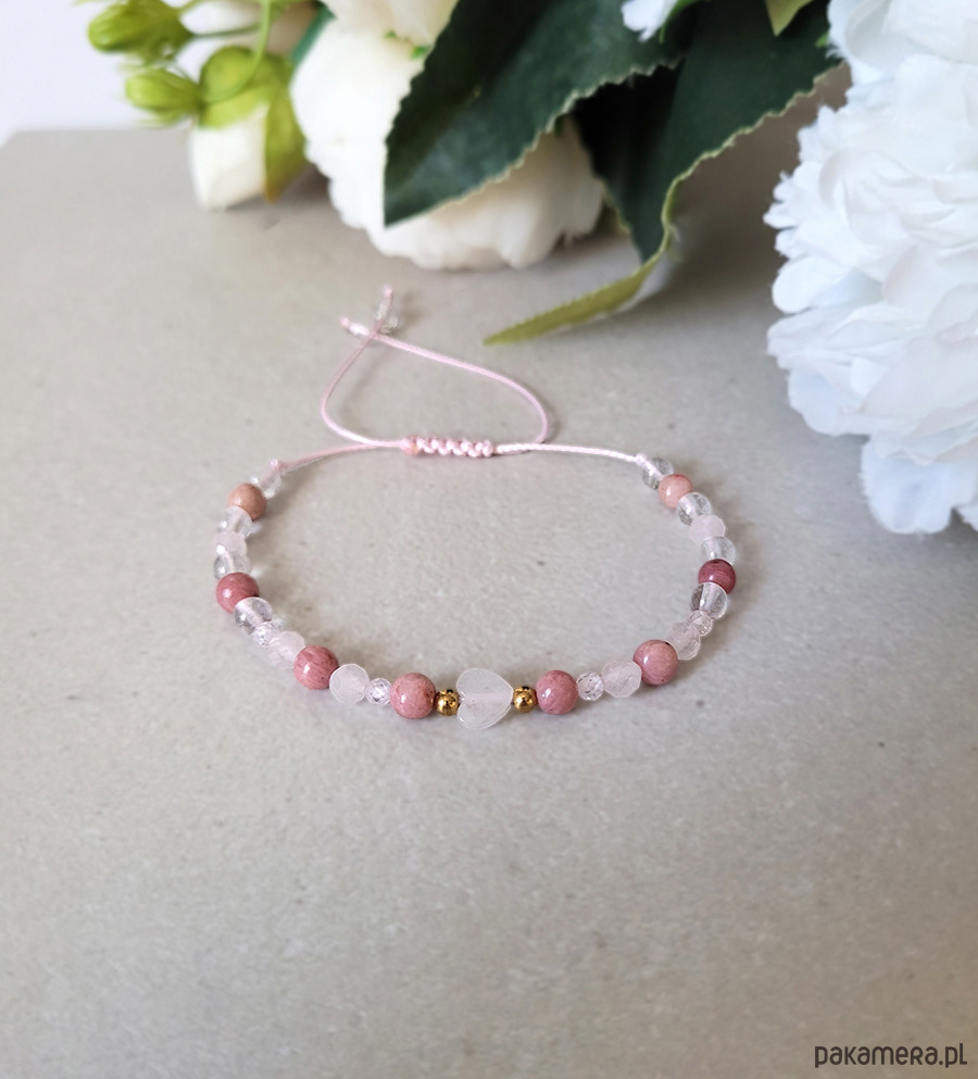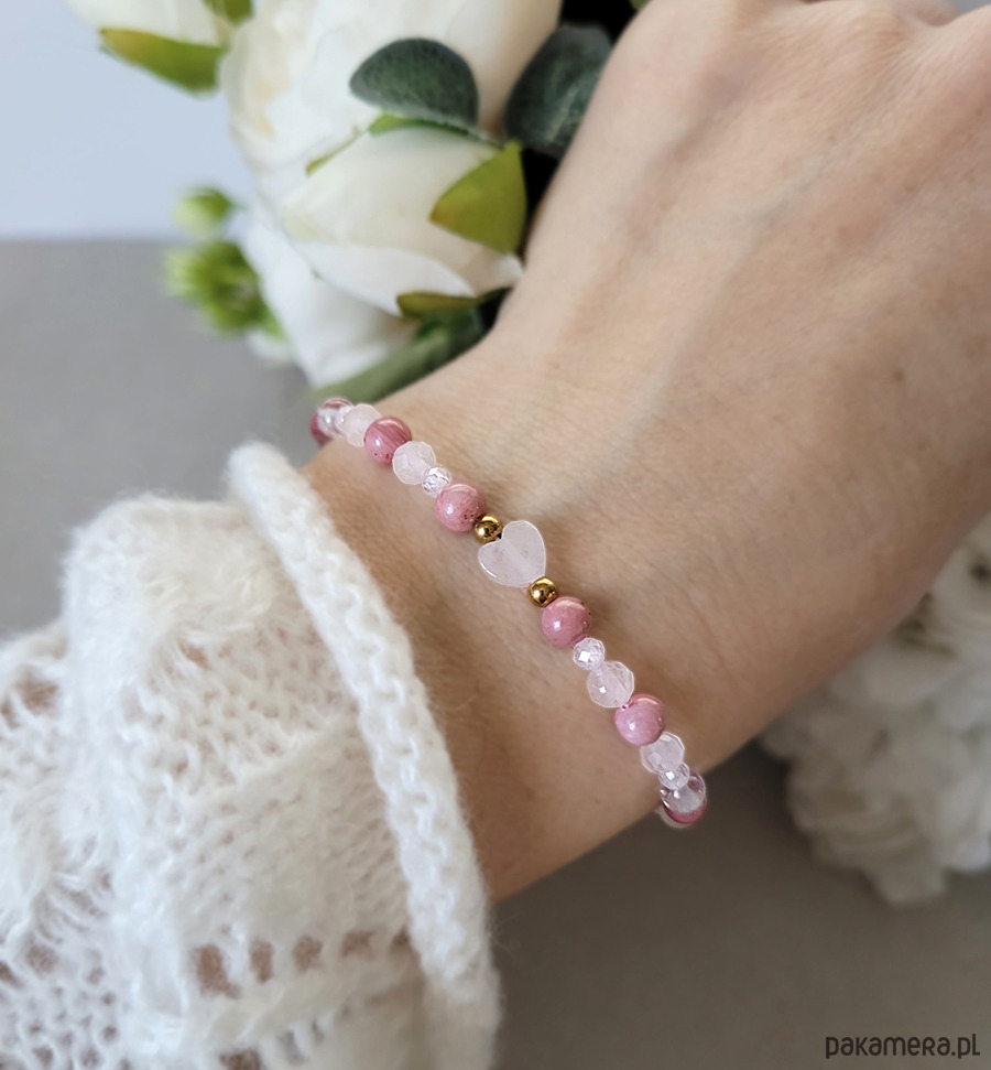 Bransoletka zrobiona z kamieni o średnicy ok. 4mm. oraz głównego serduszka z Kwarcu różowego.
