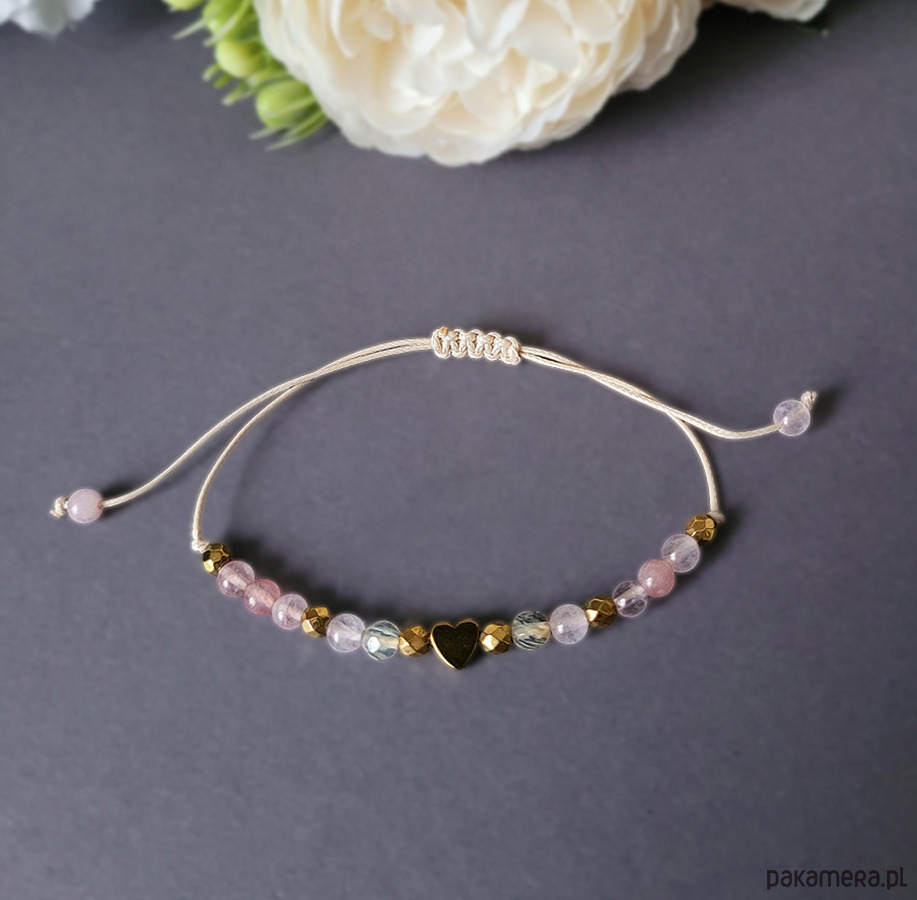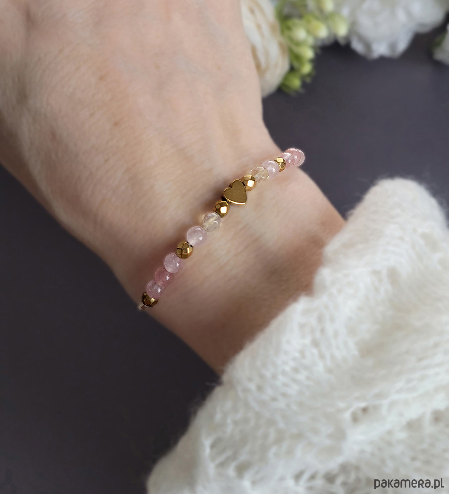 Piękna delikatna bransoletka zrobiona z kamieni naturalnych: Hematytu w kolorze złota, Cytrynu, Kamienia słonecznego, Kwarcu różowego.