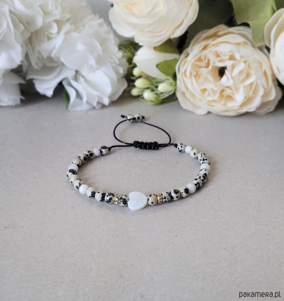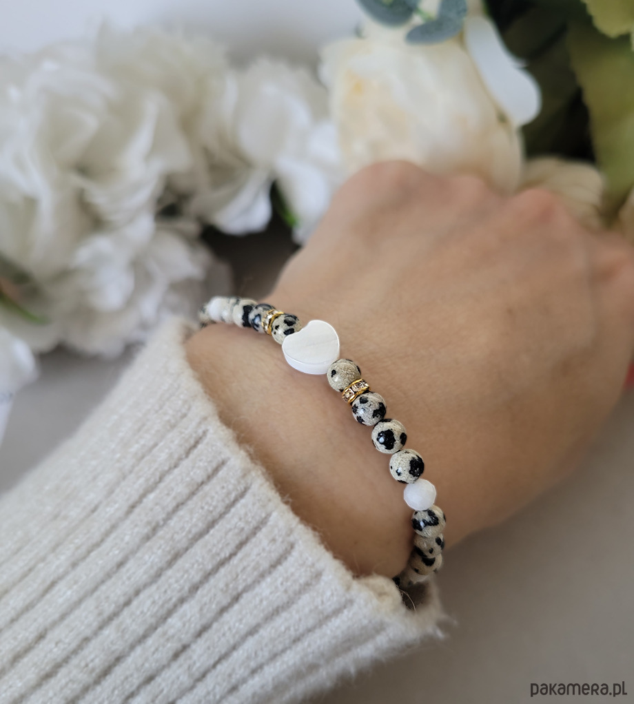 Bransoletka zrobiona z kamieni naturalnych: Jaspisu dalmatyńskiego, Kamienia księżycowego oraz masy perłowej.