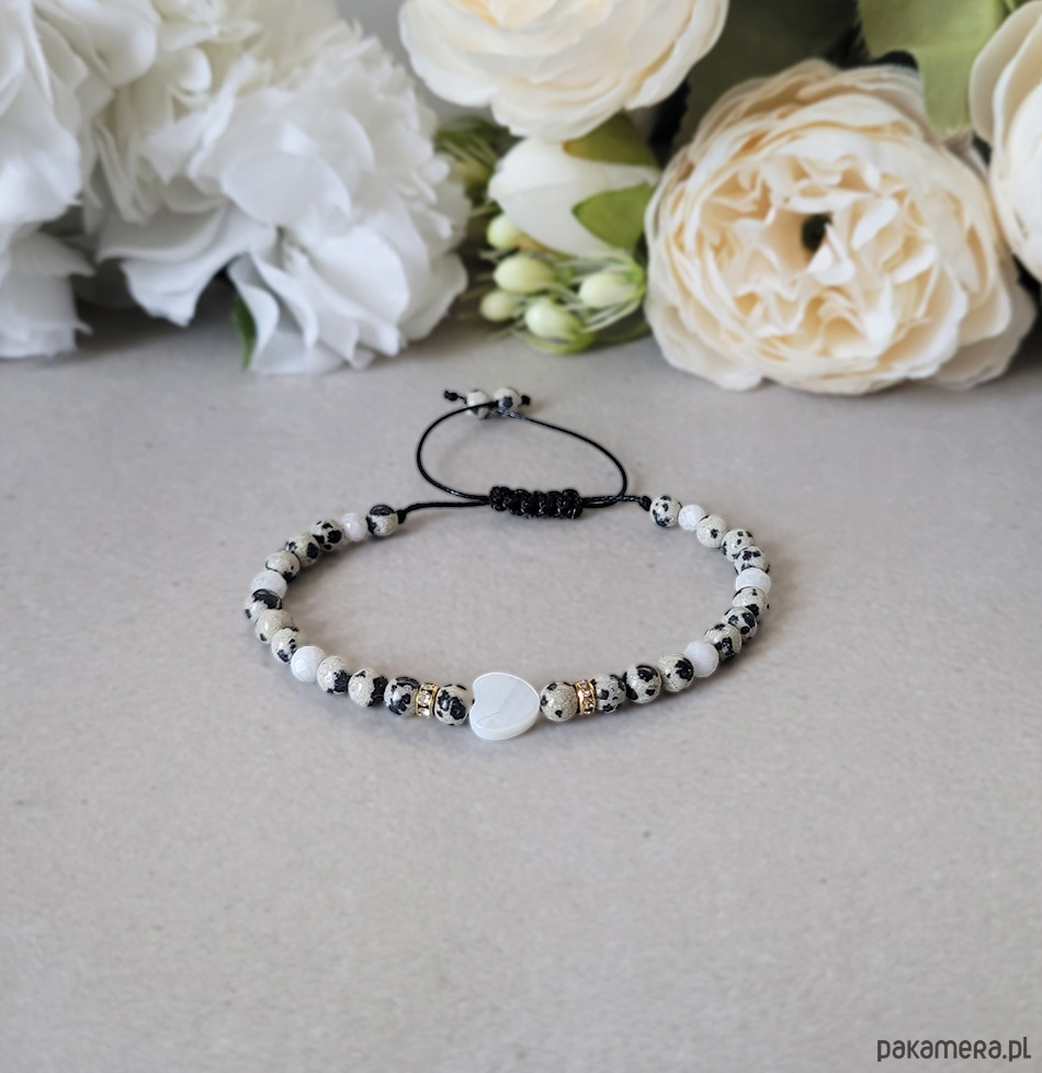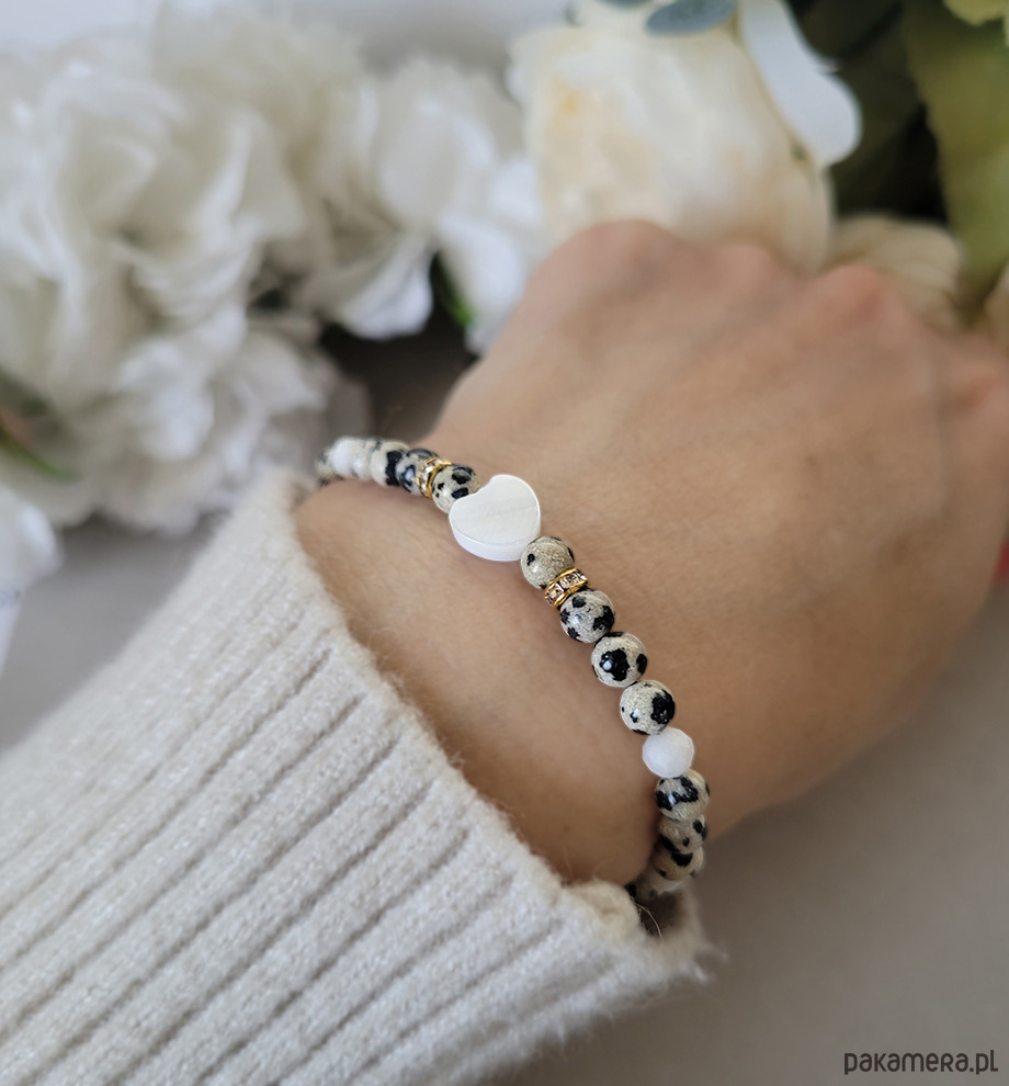 Bransoletka zrobiona z kamieni naturalnych: Jaspisu dalmatyńskiego, Kamienia księżycowego oraz masy perłowej.