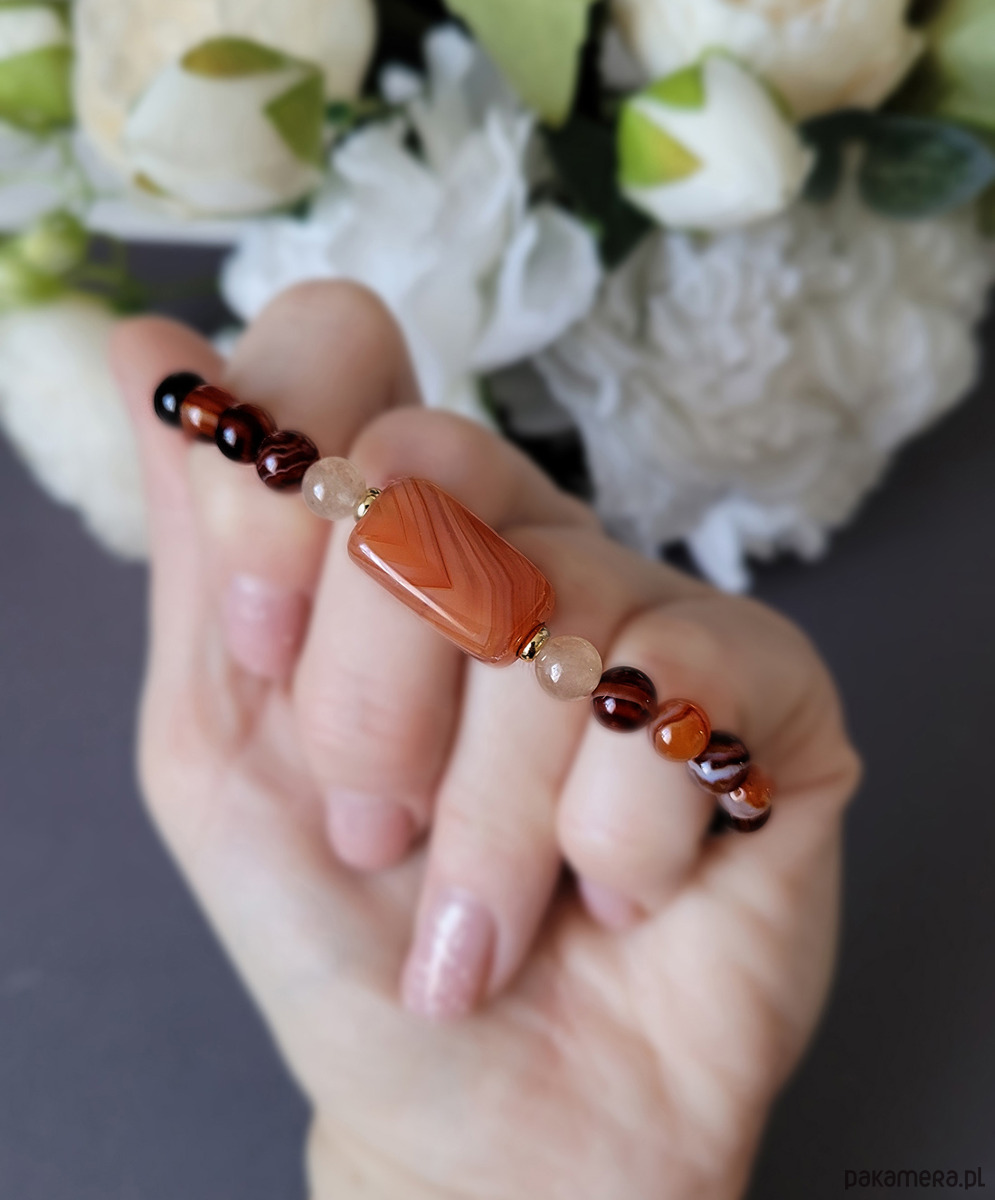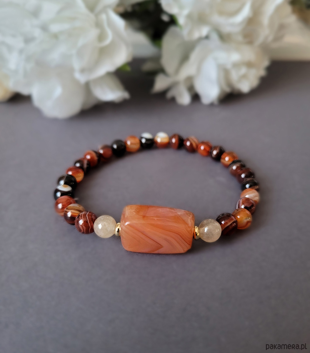 Bransoletka zrobiona z kamieni o średnicy ok. 6mm oraz głównego elementu o wymiarach ok. 1x2cm