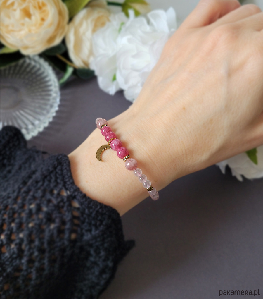 Delikatna bransoletka zrobiona z kamieni naturalnych: Opalu różowego, Rodochrozytu, Kwarcy różowego oraz Hematytu z przywieszką Księżyca.