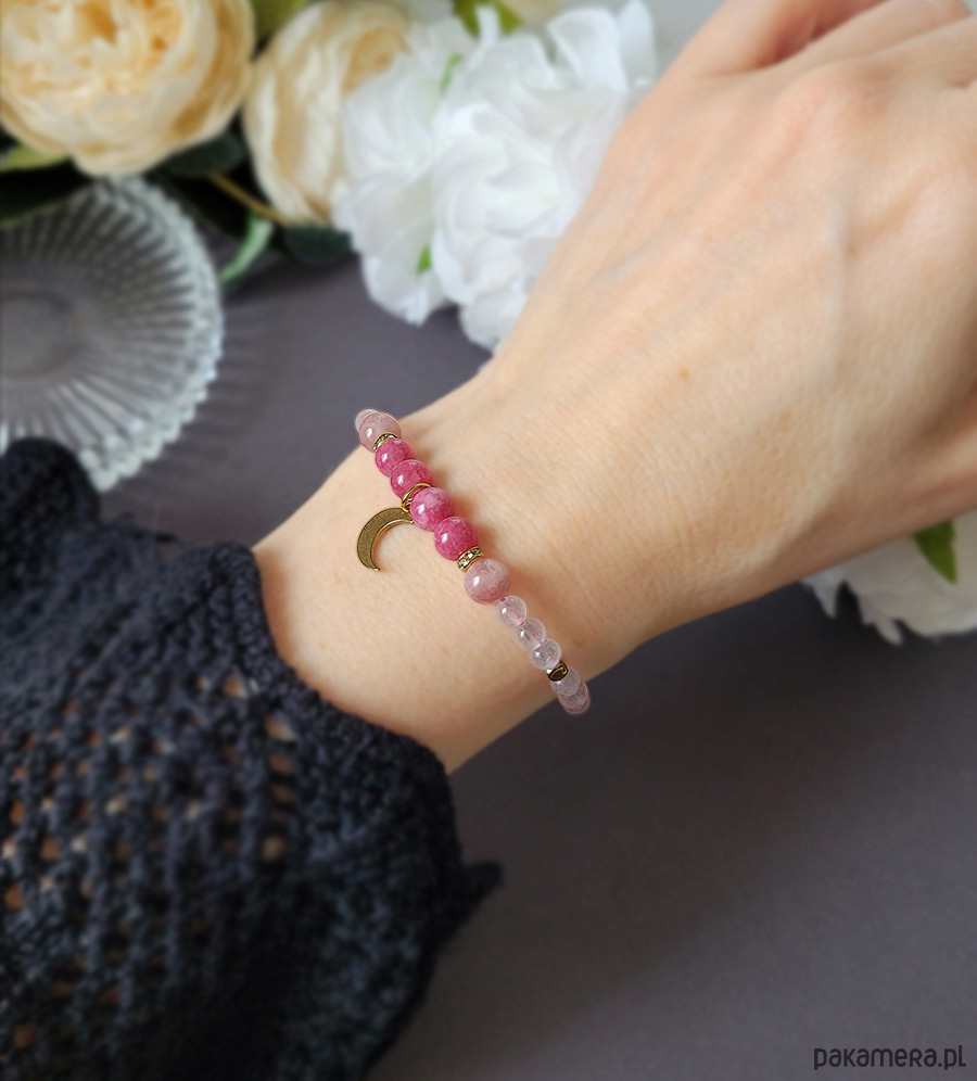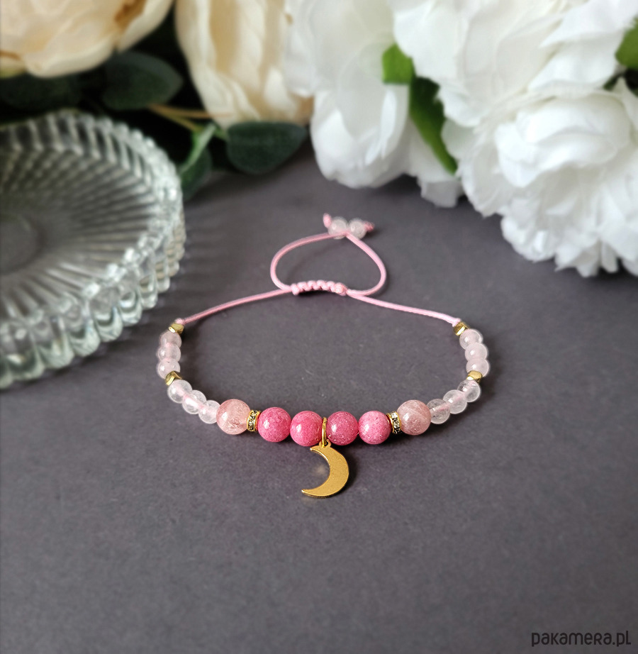 Delikatna bransoletka zrobiona z kamieni naturalnych: Opalu różowego, Rodochrozytu, Kwarcy różowego oraz Hematytu z przywieszką Księżyca.