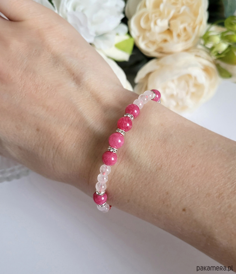 Piękna bransoletka zrobiona z kamieni naturalnych: Rodochrozytu oraz Kryształ górski.