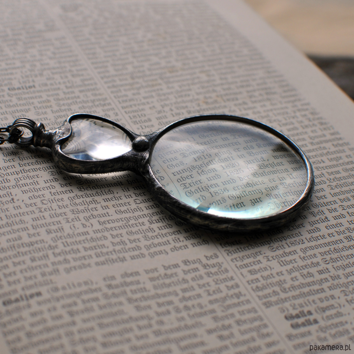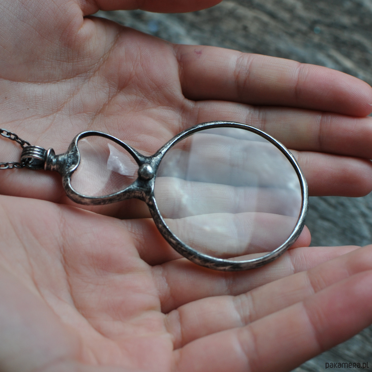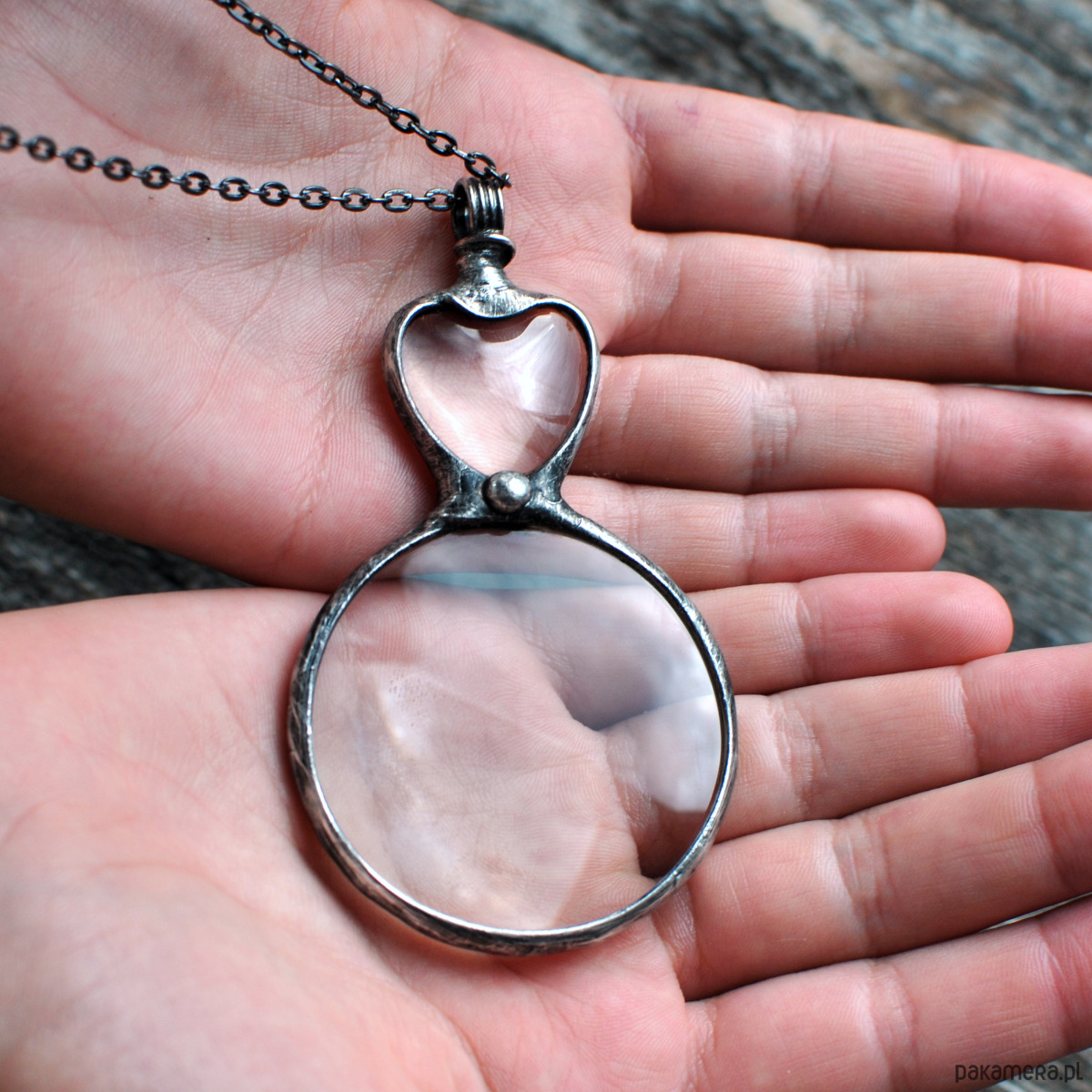 Szkło o średnicy 5 cm powiększa aż 5-krotnie, więc wisiorek ma nie tylko charakter ozdobny, ale i praktyczny.