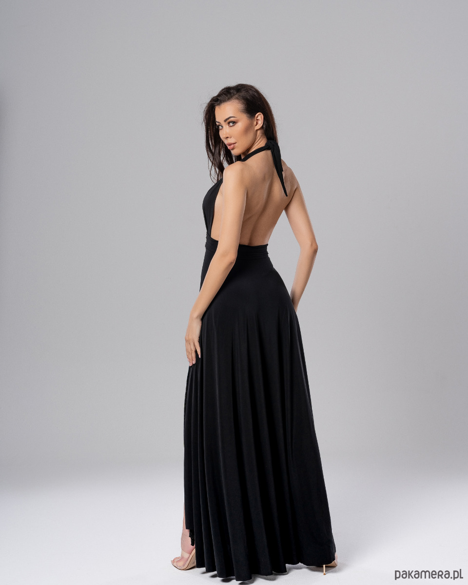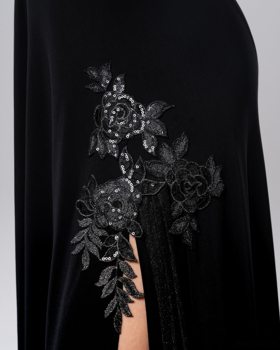 Mimosa jest to czarna suknia wieczorowa w długości maxi. Góra sukni jest skrojona w formie miseczek wiązanych na szyję. Pasek ozdobiony został małymi pliskami co dodatkowo podkreśla talię. Dół sukni w formie półklosza z podwónie odszytej lejącej dzianina typu Swarovski sprawi że Twoja figura będzie wyglądała posągowo. Głównym atutem sukni jest wysoki rozporek na nodze, ozdobiony koronką z cekinami oraz błyszczącymi paskami. Suknia zapinana na zamek z tyłu.
