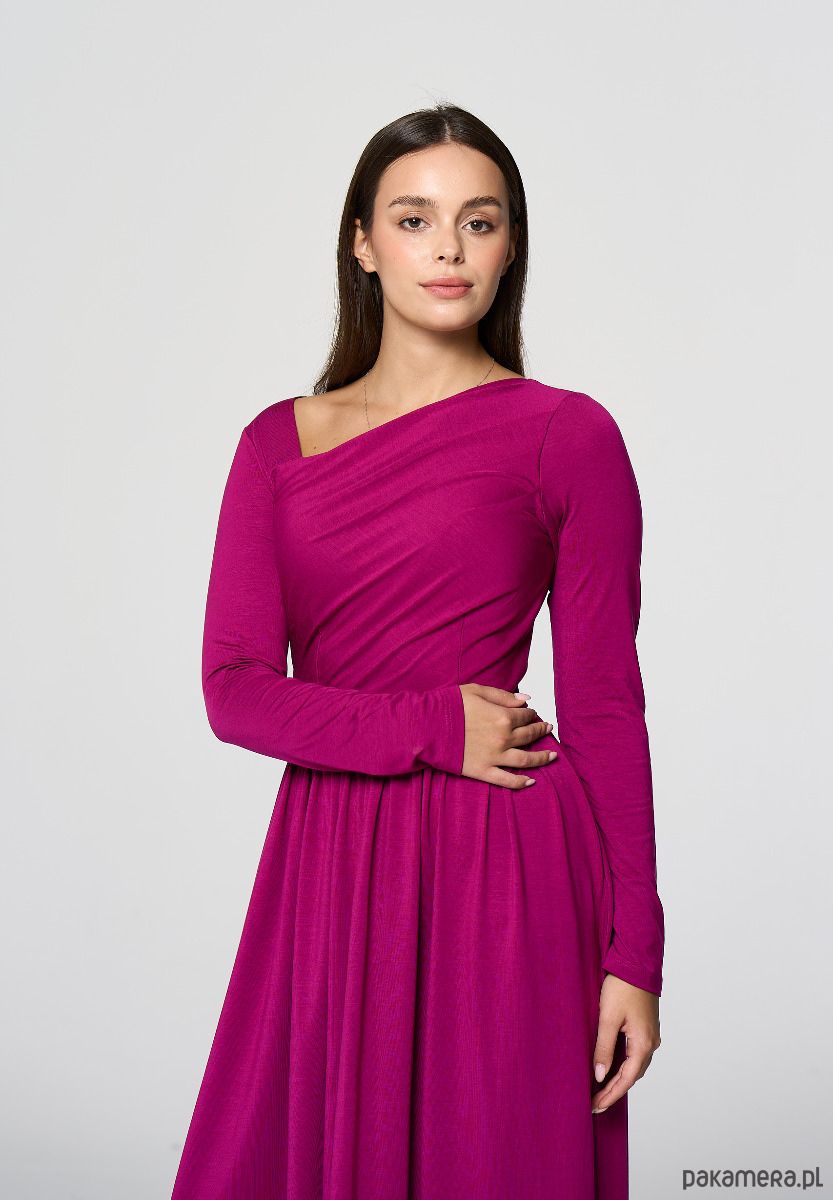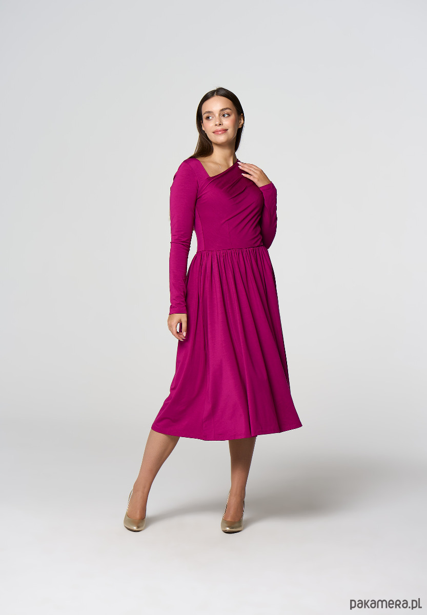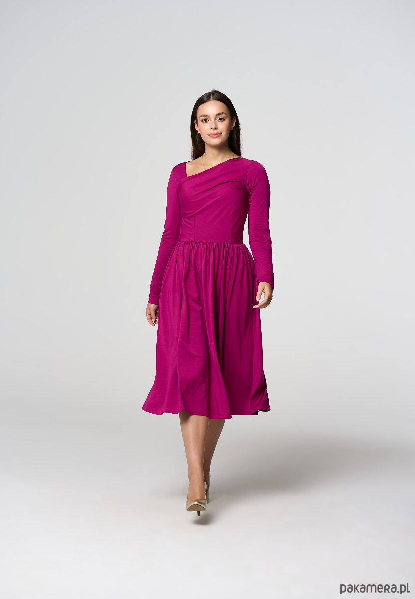 Sukienka midi z asymetrycznym dekoltem i dekoracyjnym marszczeniem na lewym ramieniu.