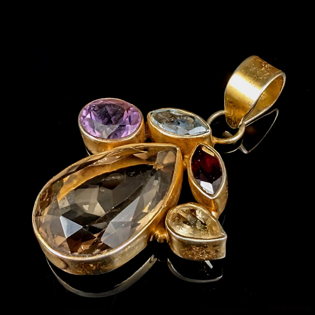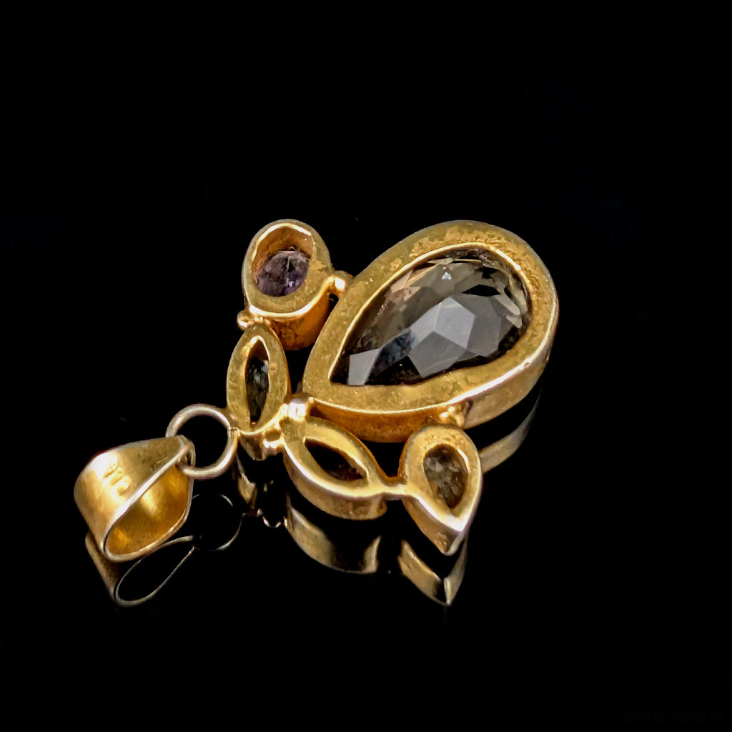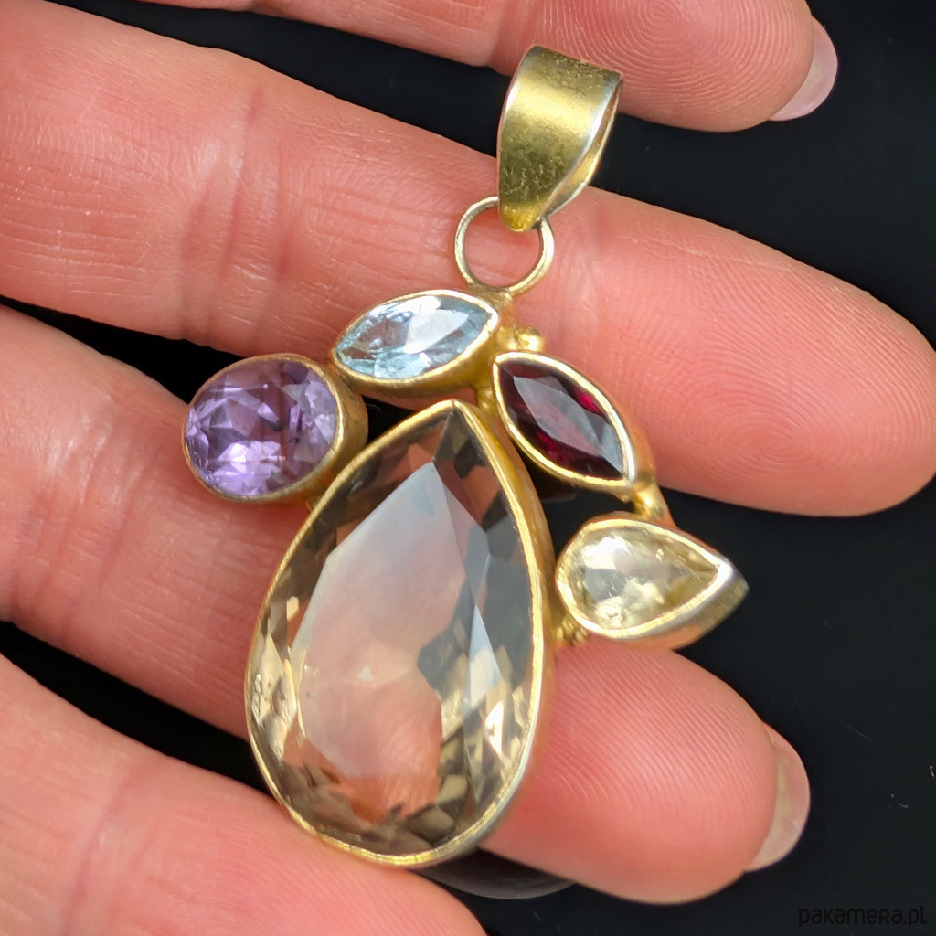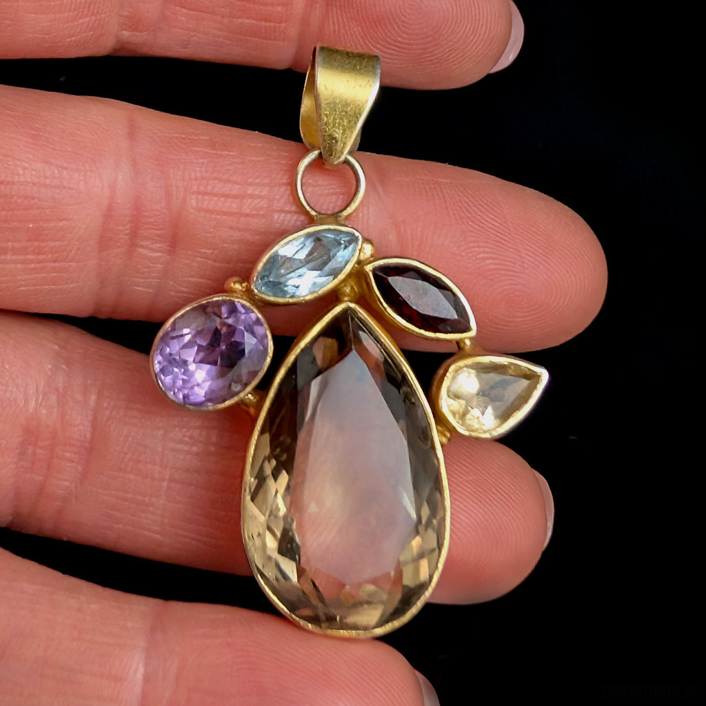 Oryginalny wisior wykonany ze srebra próby 925 oraz pięknego kwarcu dymnego w towarzystwie ametystu, topazu, granatu i cytrynu. Przepiękna kompozycja kamieni. Srebro zostało pozłacane, złocenie będzie się ścierać, miejscami widoczne srebro. Wymiary wisiora 33 x 32 mm. Długość max 48 mm, waga 14,7 grama. Wykonany przez dostawcę kamieni. Zostanie wysłany w ozdobnym pudełeczku.