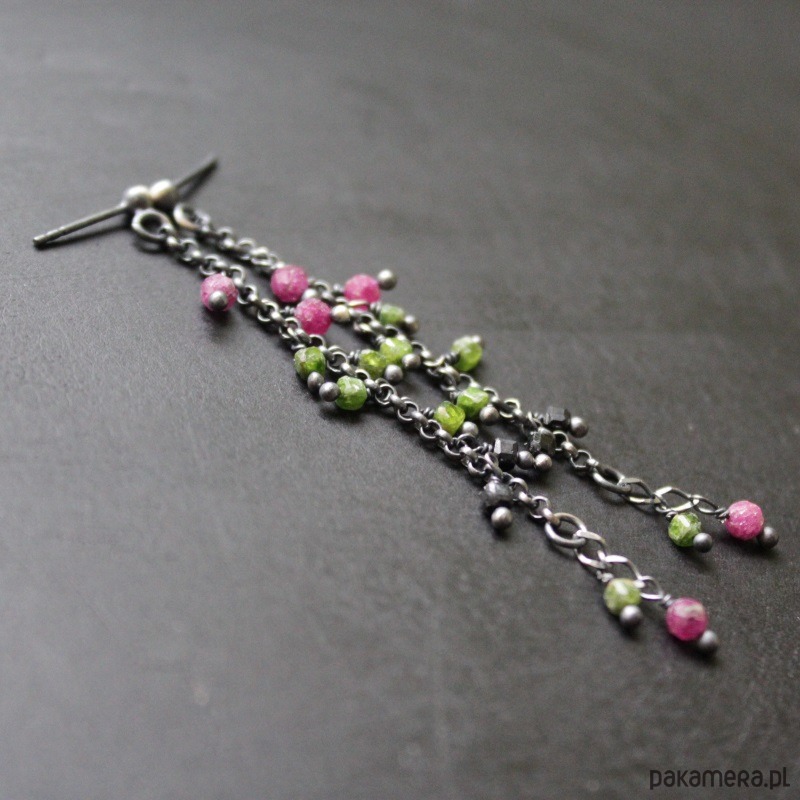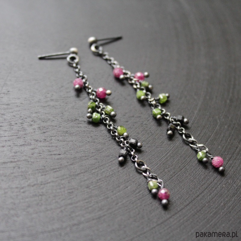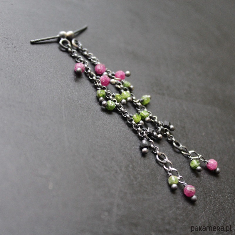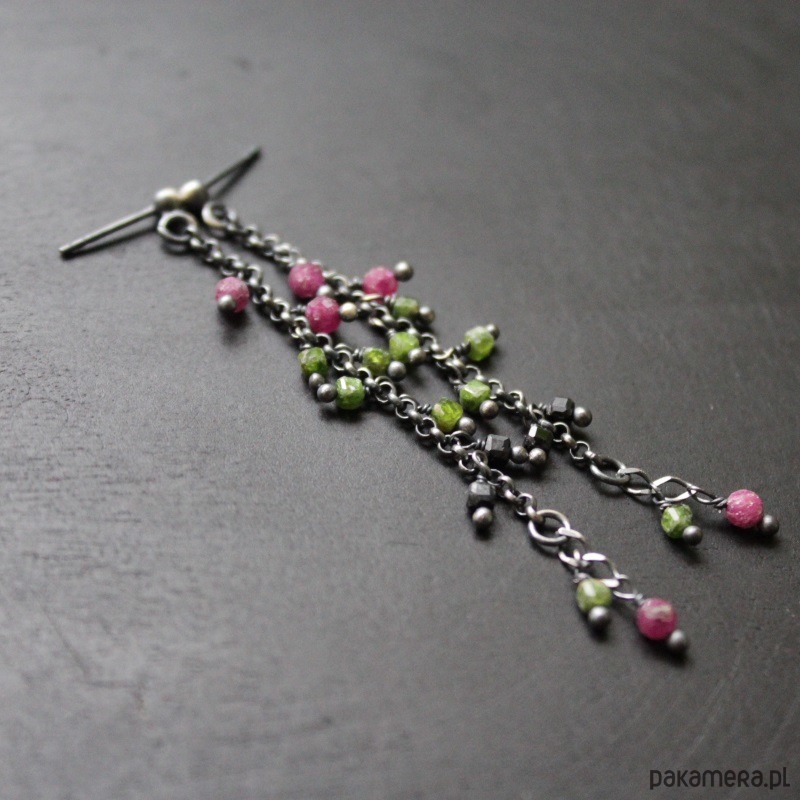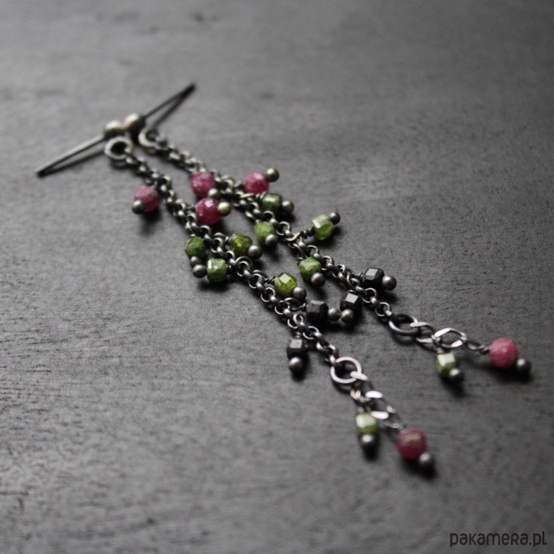 Kamienie: przepiękne fasetowane rubiny wielkości 0,4 cm, fasetowane kosteczki diopsydu wielkości 0,25 cm oraz fasetowane kosteczki czarnego turmalinu wielkości 0,25 cm .