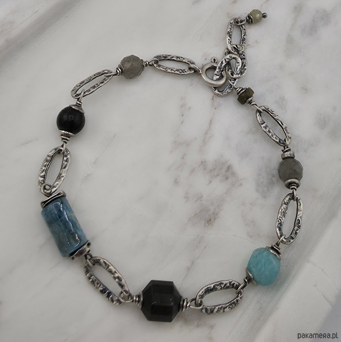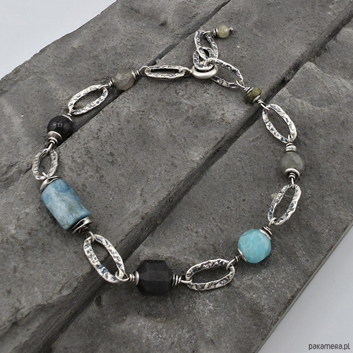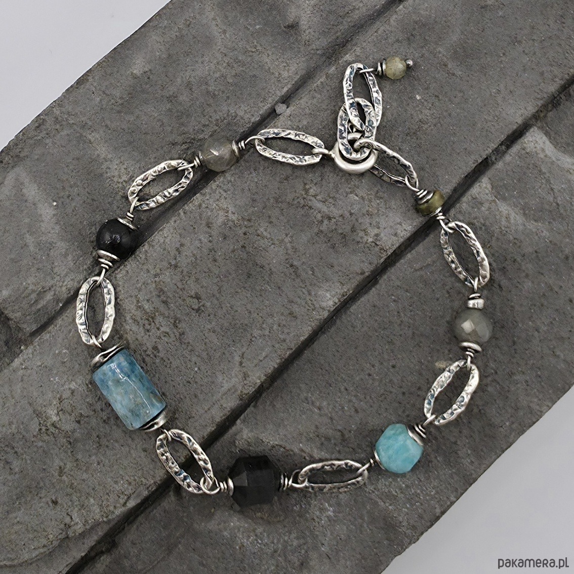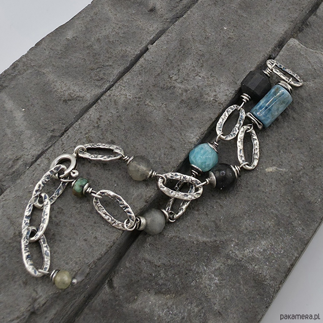 Modna i kobieca bransoletka na co dzień i nie tylko. Wykonana w całości z oksydowanego srebra próby 925 oraz kamieni turkusu, apatytu, labradorytu, amazoniitu, zielonego kyanitu wielkości 4 - 12 mm. Wielkość ogniw łańcuszka to 11x5,5 mm. Całkowita długość bransoletki to 18,5 cm plus regulacja 1,5 cm. Ozdobnie zapakowana.
