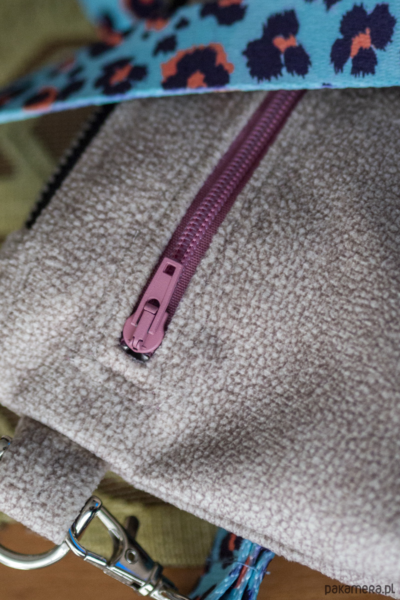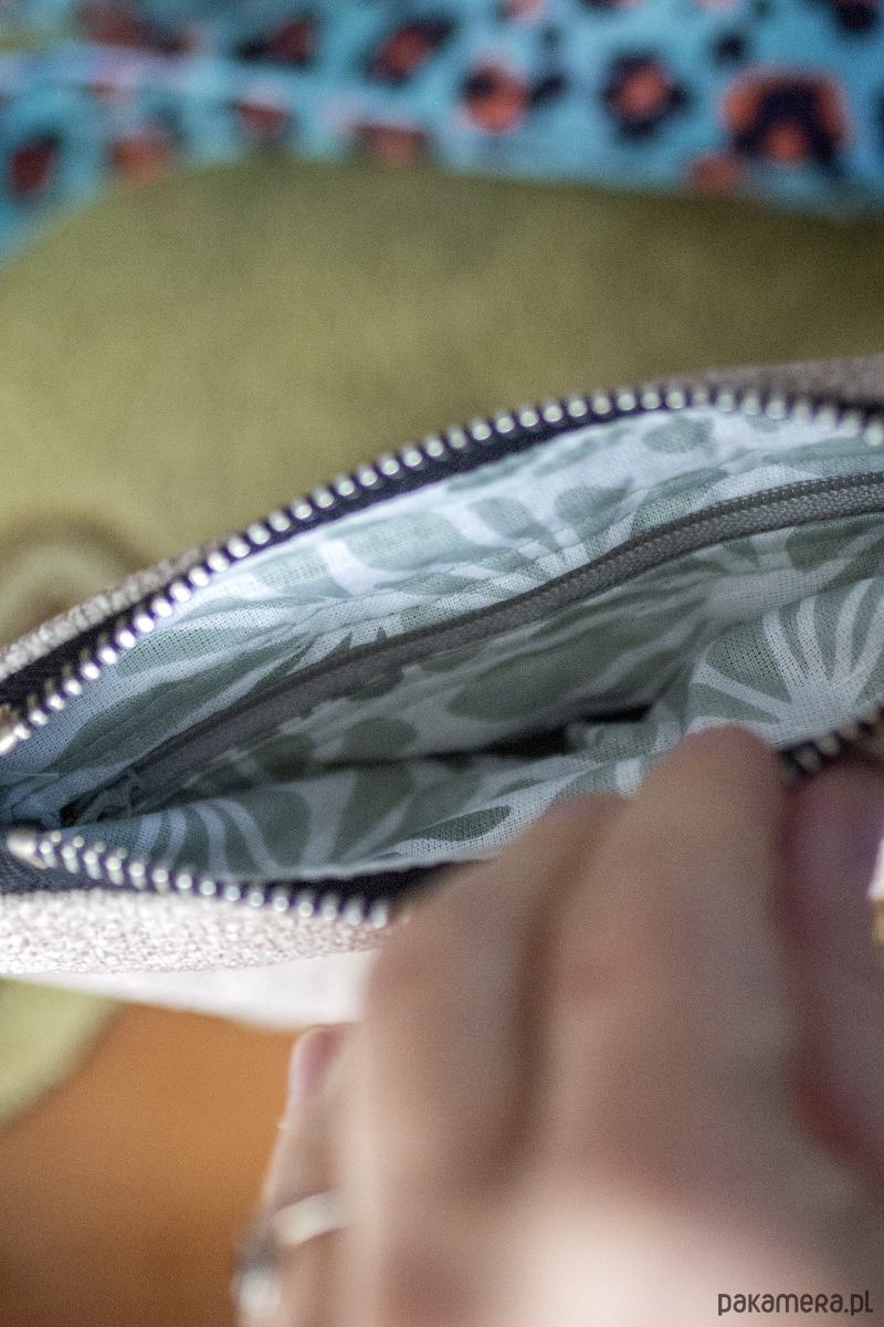 Małe zaszewki na dnie. Z tyłu oraz w środku torebki kieszonki zapinane na suwak. Środek wykończony bawełnianą podszewką.