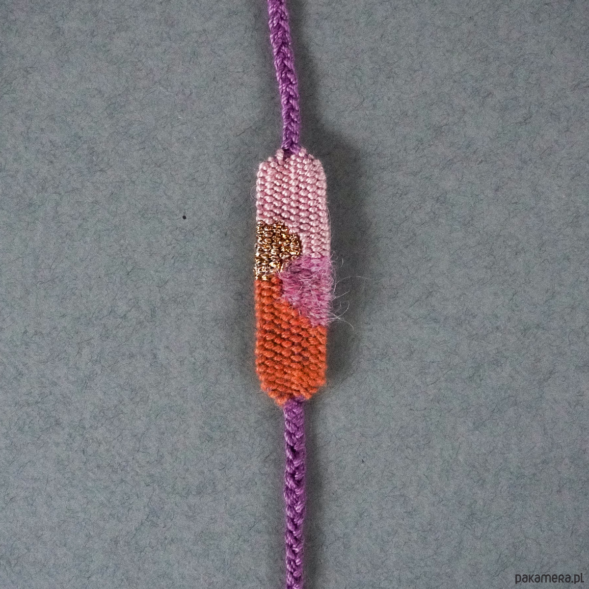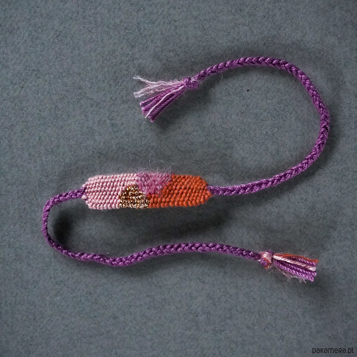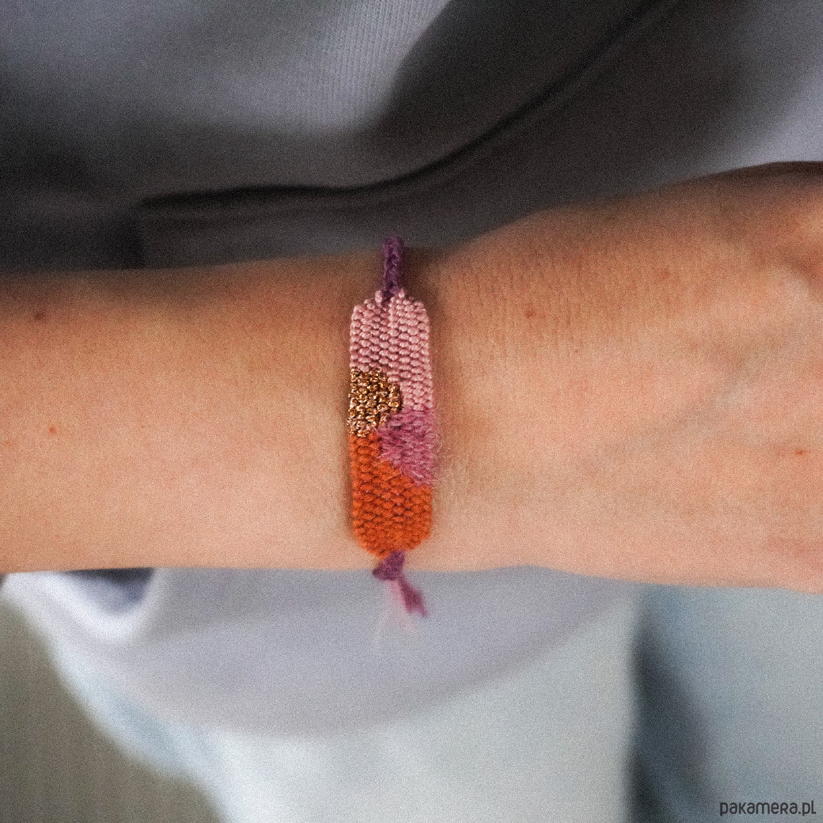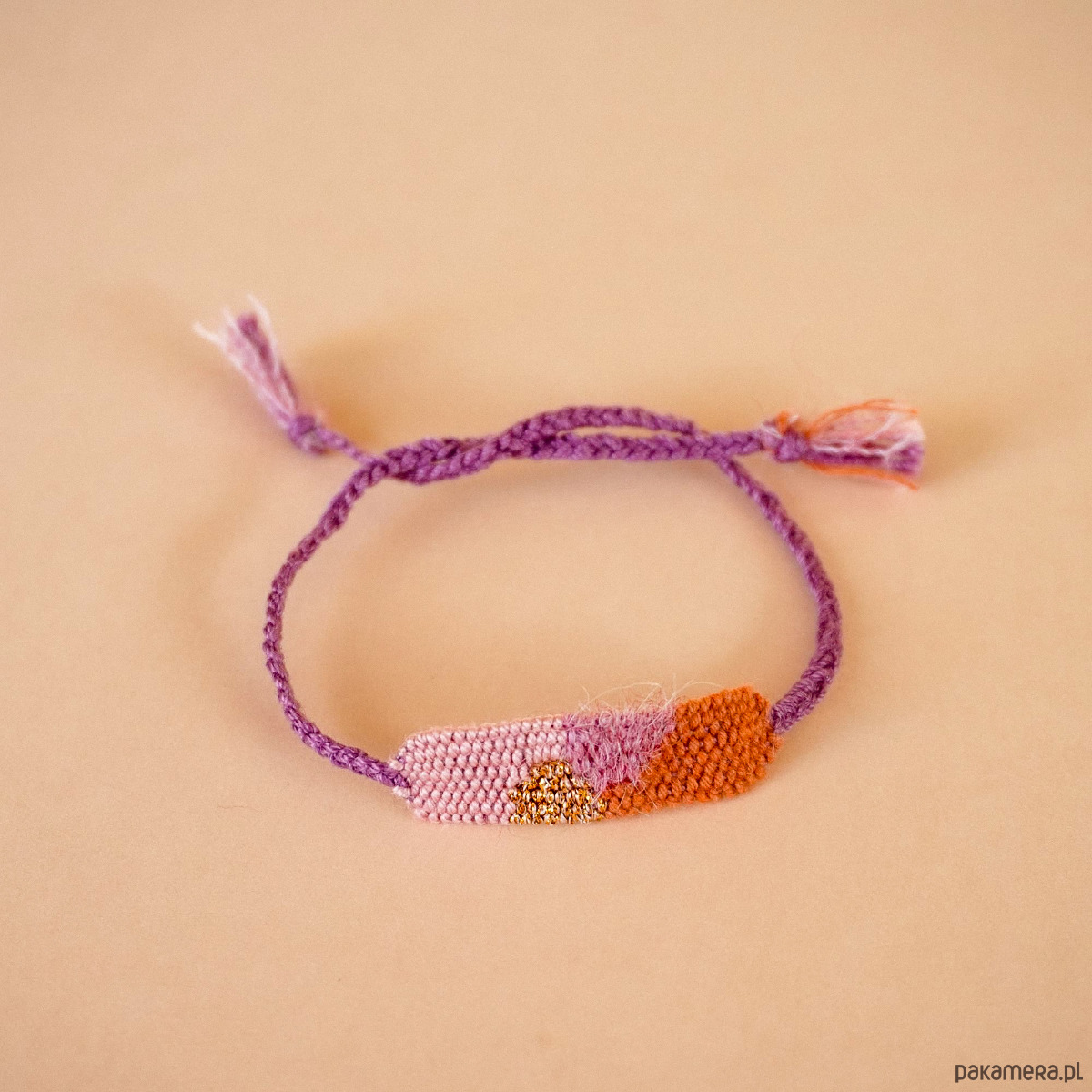 Prześliczna bransoletka tkana ręcznie. Część tkana ma około 4 cm długości, około 1 cm szerokości. Bransoletkę wiążemy samodzielnie, dość mocno na supełek.