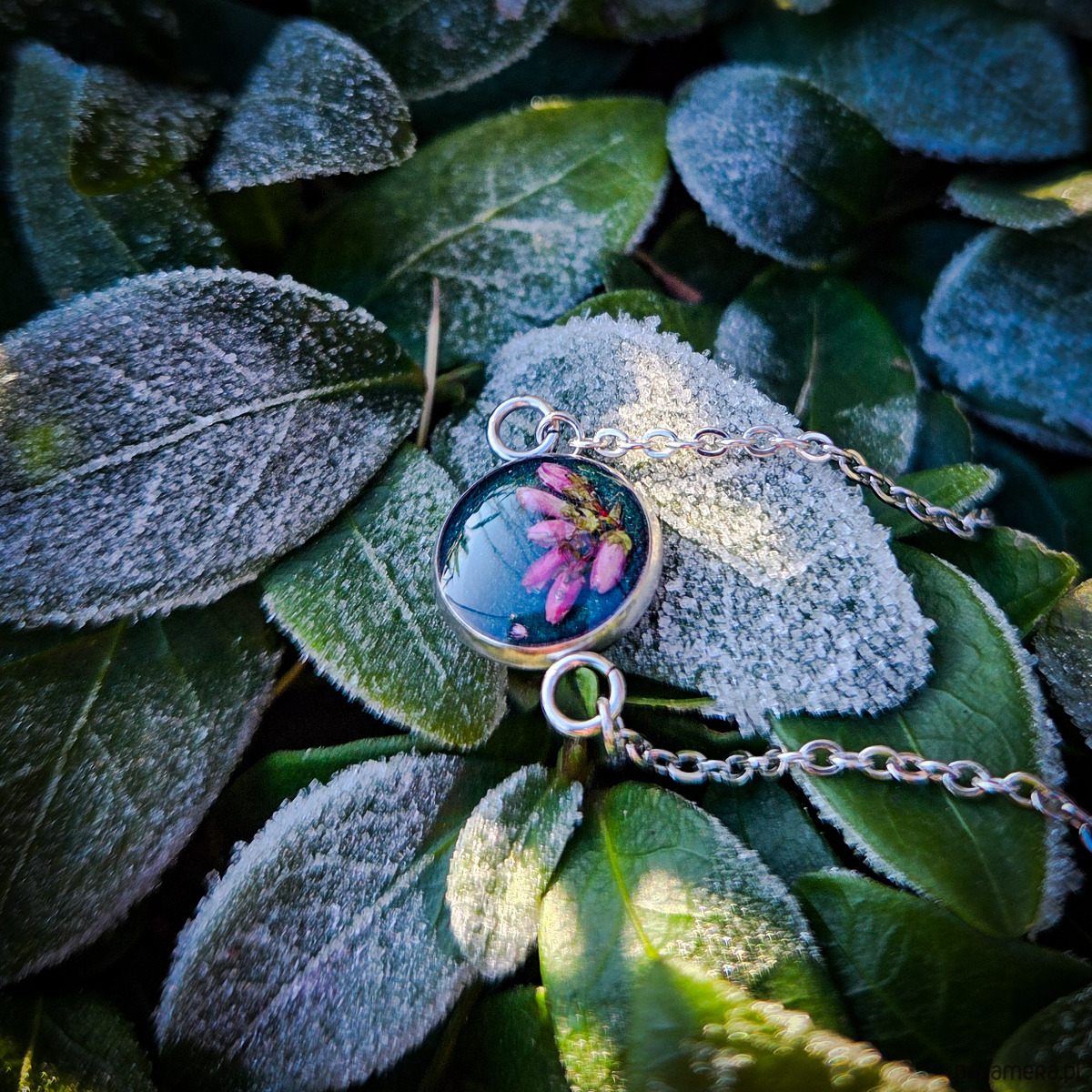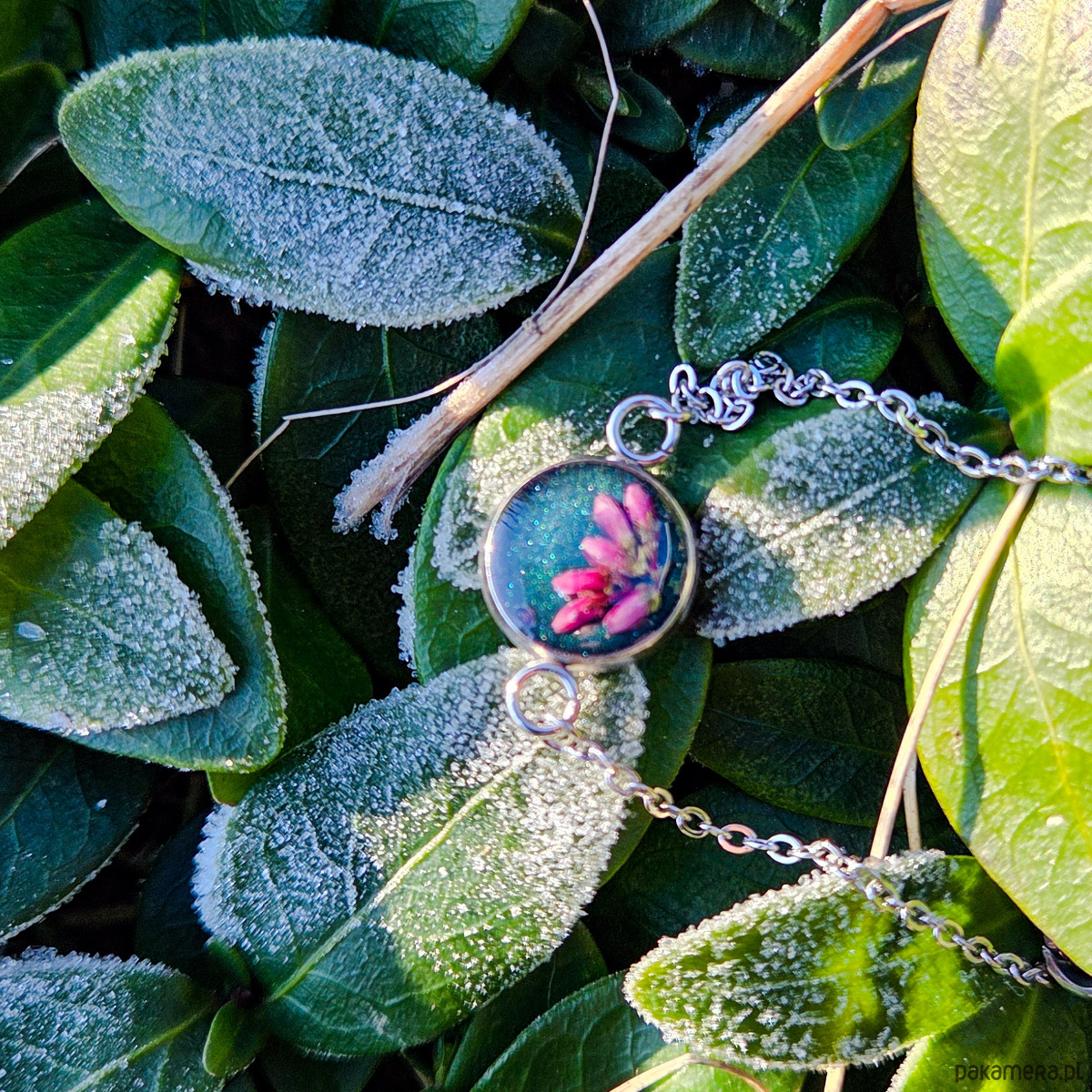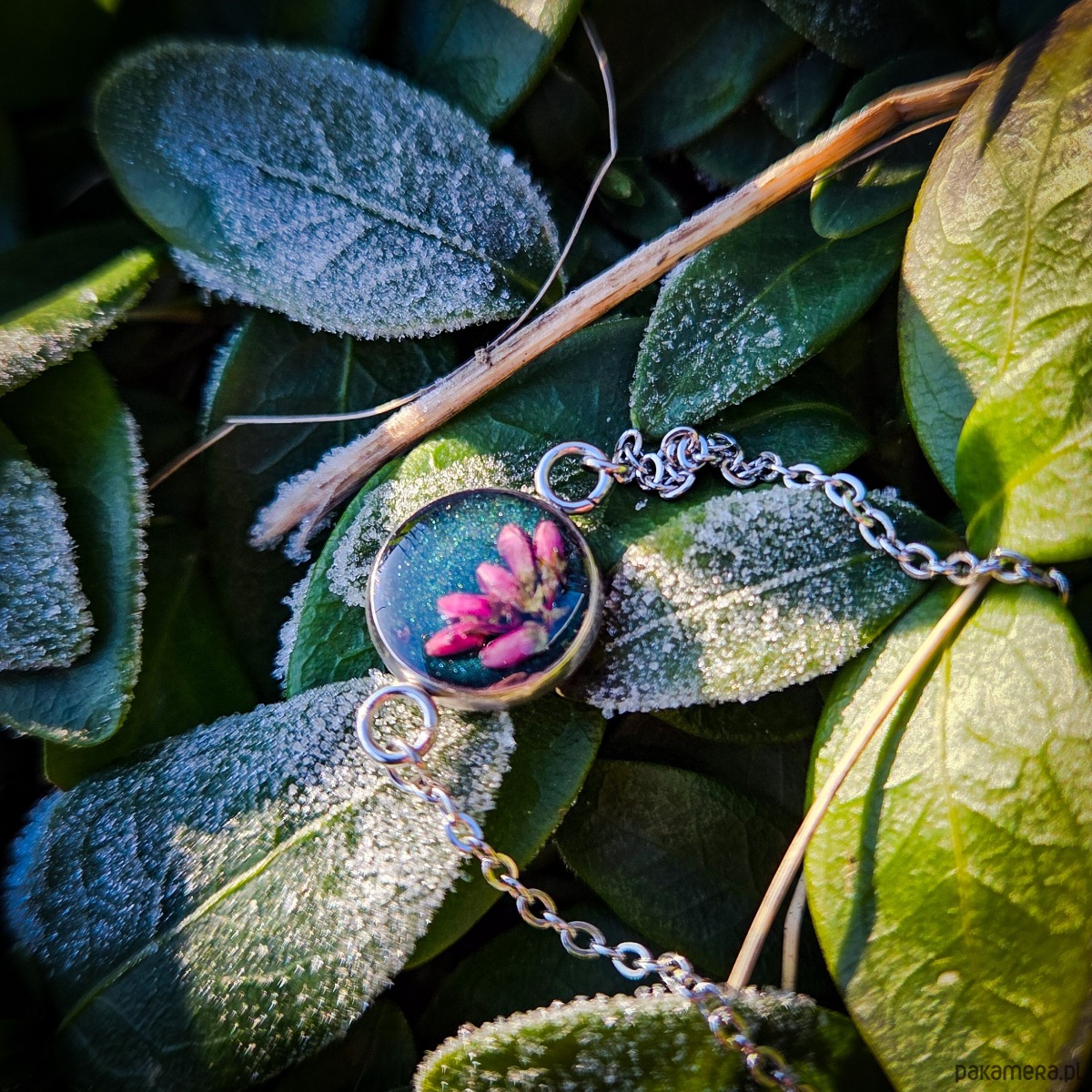Bransoletka z oczkiem z zatopionym w żywicy epoksydowej wrzosem.