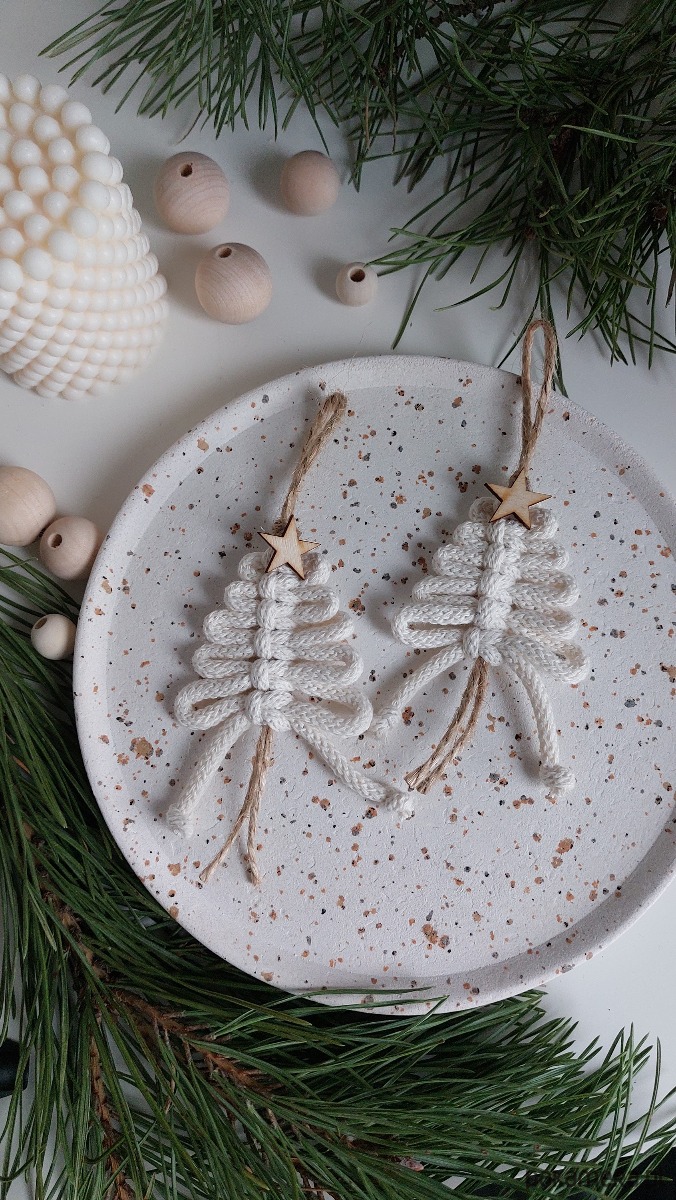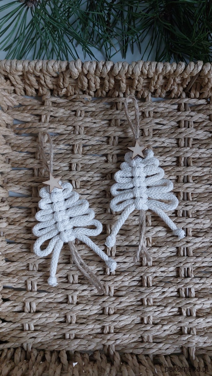 Ozdoba choinkowa wykonana własnoręcznie ze sznurka bawełnianego 5mm w kolorze naturalnym z drewnianą gwiazdką