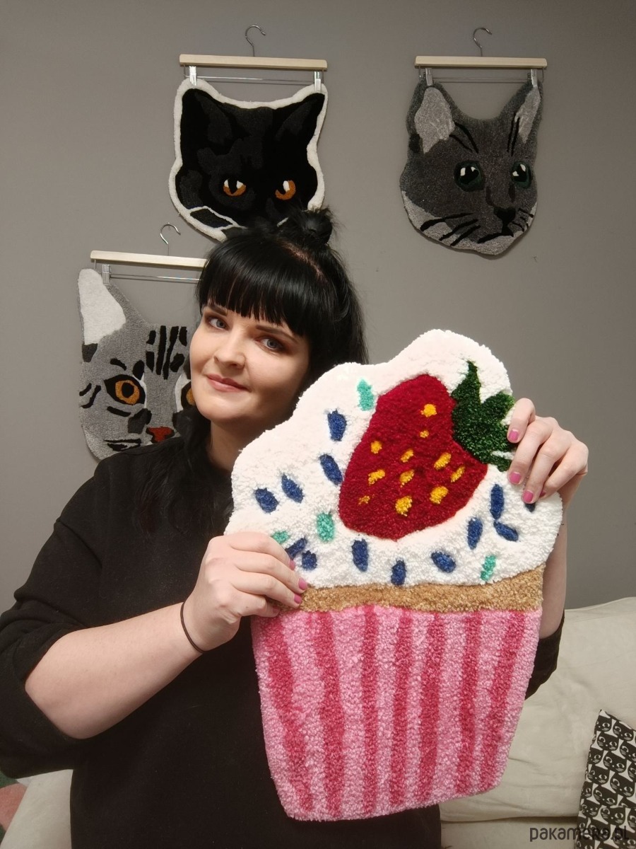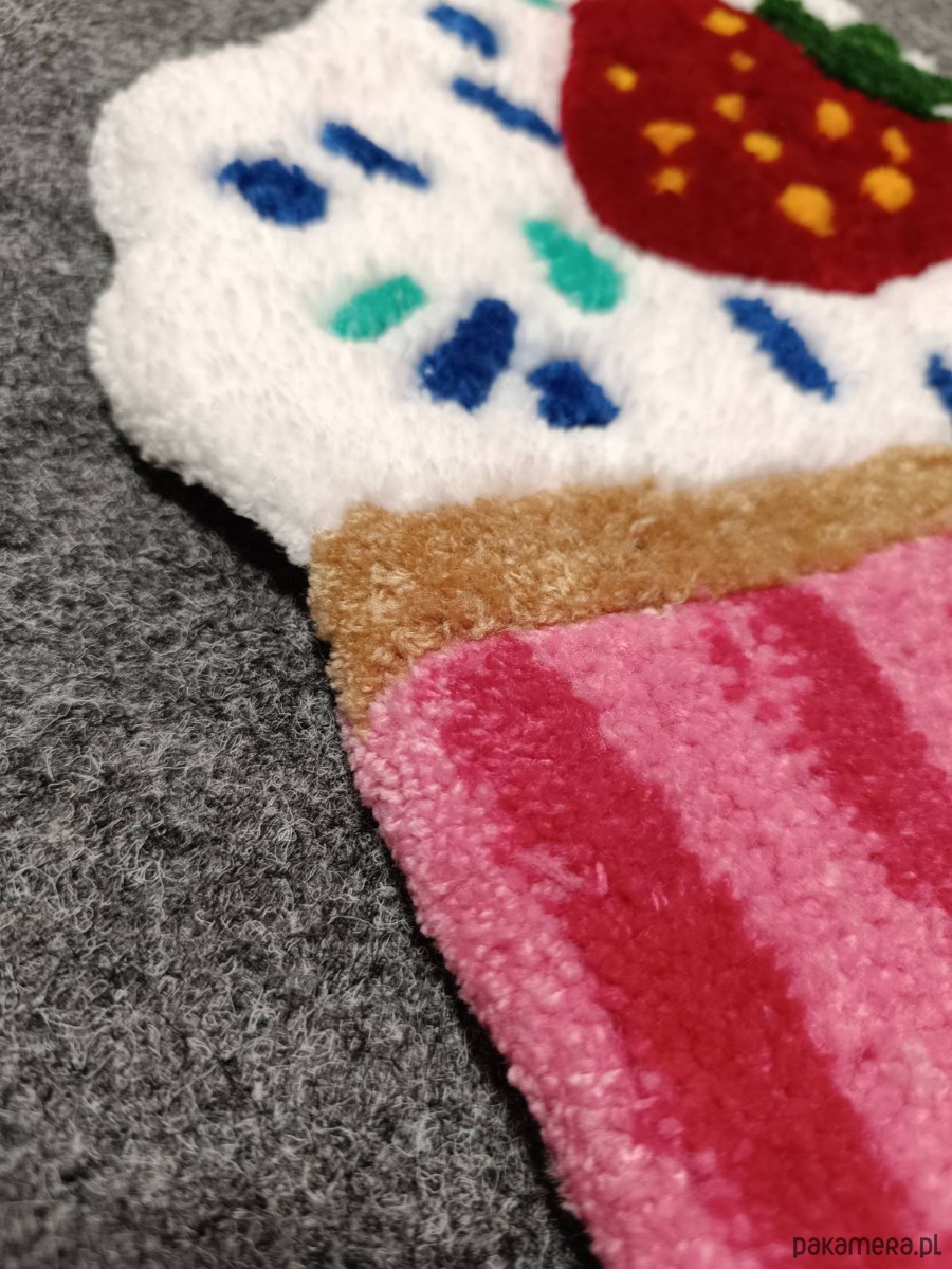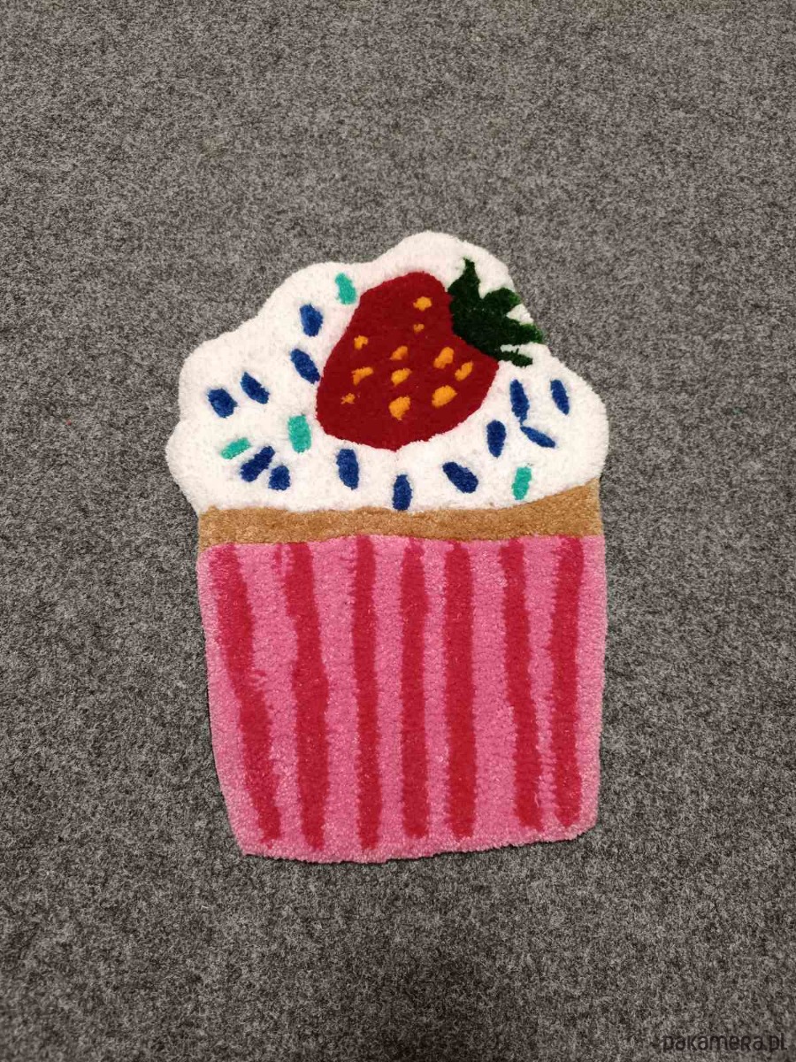 Mini dywan w kształcie babeczki truskawkowej. Wygląda tak pysznie :) Będzie fajną ozdobą na ścianę a także na stół lub biurko.