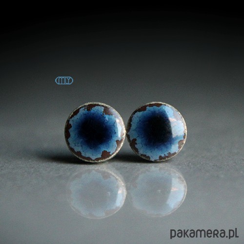 Ceramiczne okrągłe kolczyki w formie sztyftów, ręcznie wykonane z delikatnej gliny kamionkowej jednostronnie szkliwione błękitnym szkliwem z efektem plamek,na antyalergicznych sztyftach w kolorze srebrnym. Średnica ok.6mm. Polecam