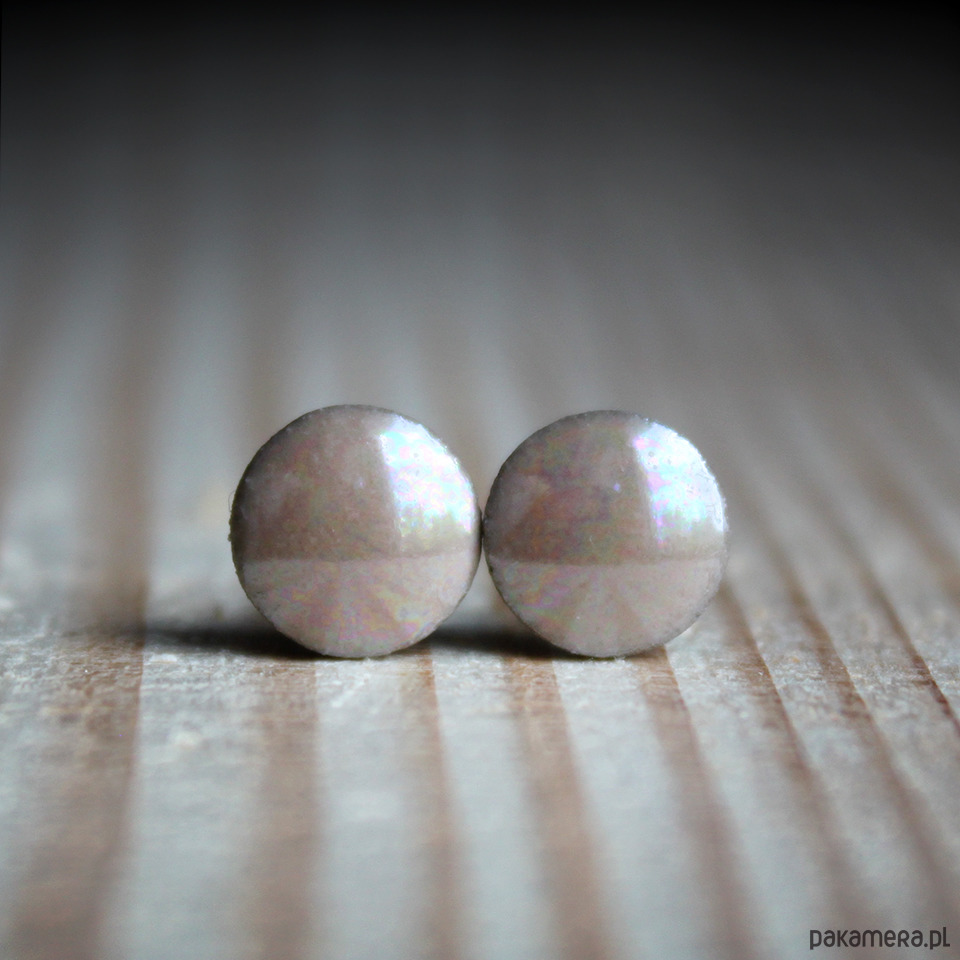 Okrągłe, lekko nieregularne ceramiczne kolczyki w formie sztyftów, ręcznie wykonane z delikatnej gliny kamionkowej, jednostronnie szkliwione mieszanką jasnobrązowych szkliw z efektem plamek, na antyalergicznych sztyftach w kolorze srebrnym. Średnica ok. 6mm.Polecam