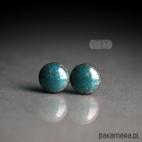 Ceramiczne, lekko nieregularne kolczyki w formie sztyftów, ręcznie wykonane z delikatnej gliny kamionkowej, jednostronnie szkliwione efektowną mieszanką błyszczących błękitnozielonych szkliw z efektem plamek, na antyalergicznych sztyftach w kolorze srebrnym.Średnica ok.6mm. Polecam