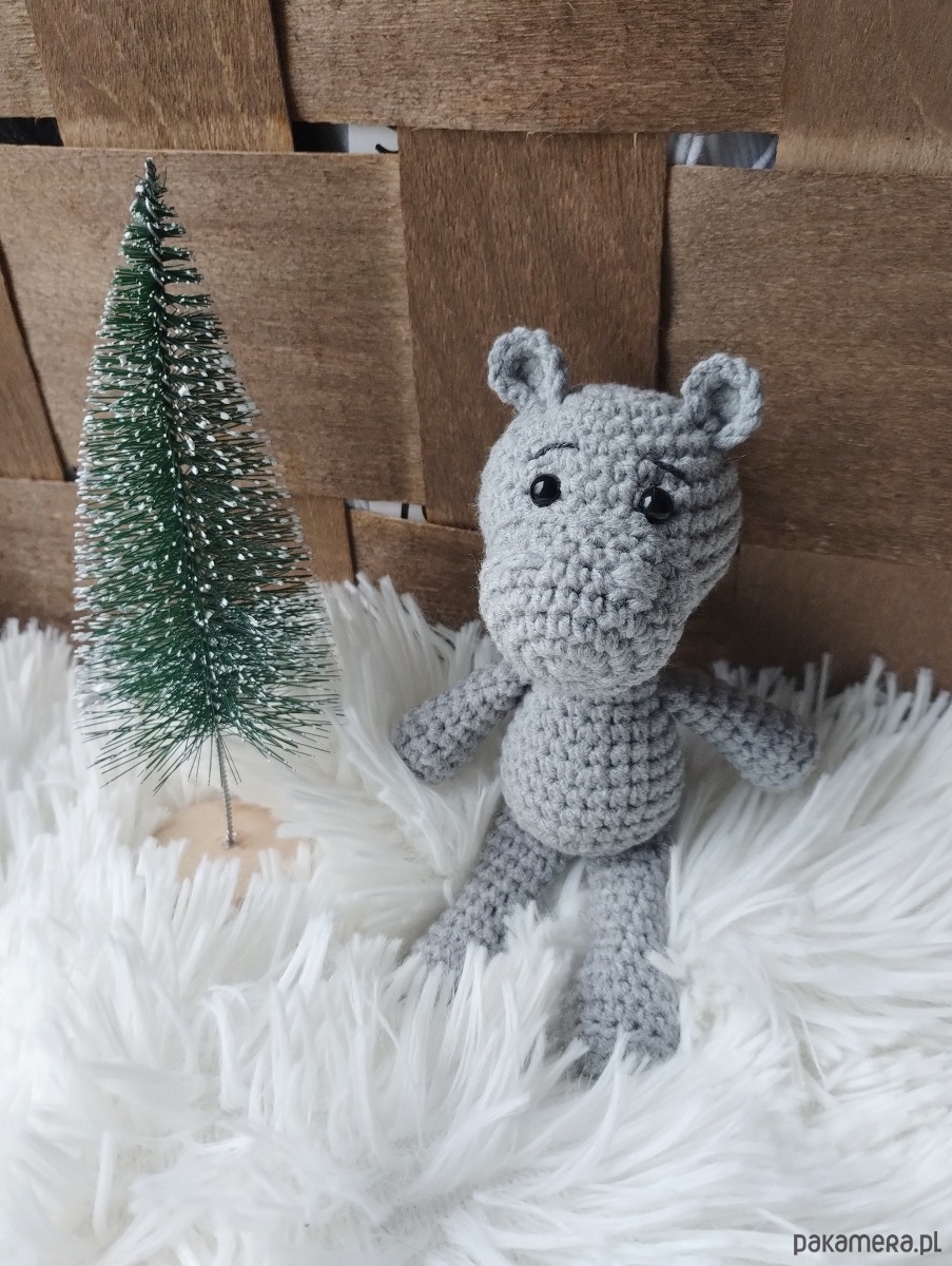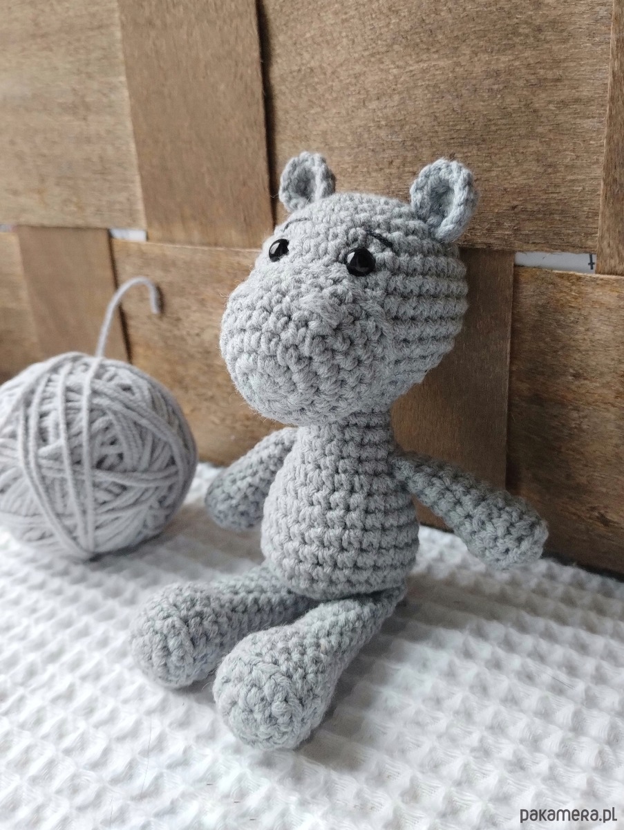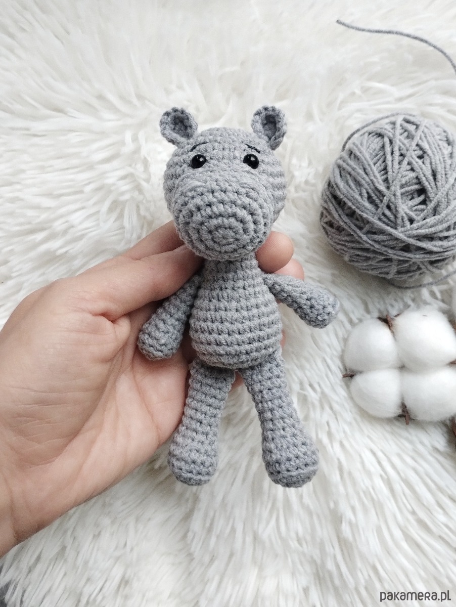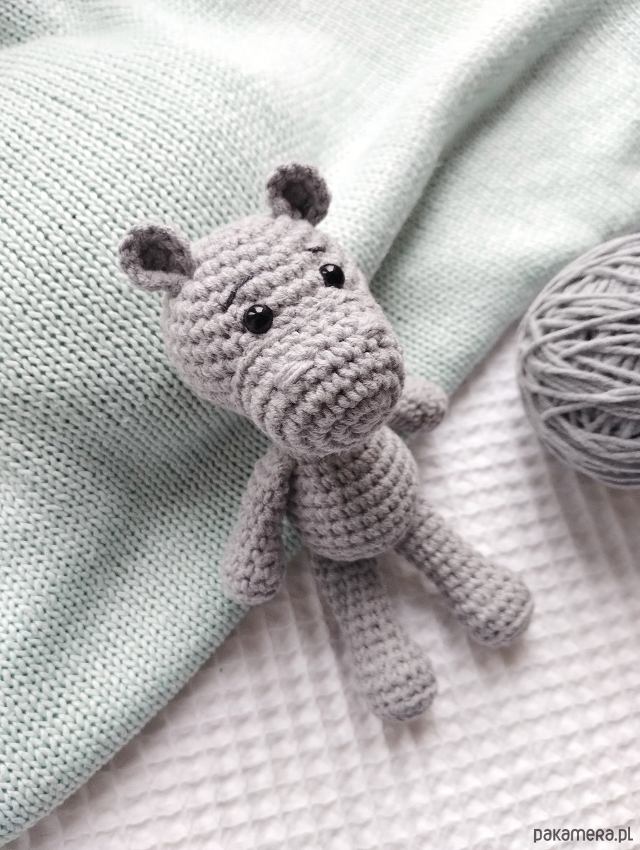 A zabawka to mini hipcio. Mini, bo pochodzi z serii namniejszych dzierganych przeze mnie zabawek. Ma ok 14 cm wzrostu, maleńkie uszka i spokaźną mordkę - jak na hipopotama przystało. Będzie doskonałym towarzyszem każdej zabawy, a biorąc pod uwagę jego kieszonkowy rozmiar będzie mógł wyruszyć na każdą wyprawę!