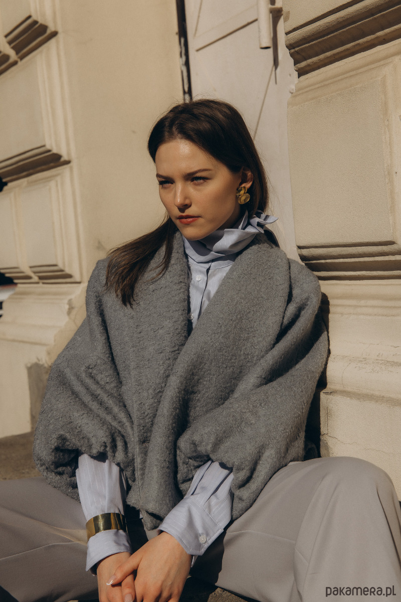 mini HOKKAIDO’ to kimonowa kurta z miękkiej, wełnianej tkaniny bouclé, w odcieniu gołębiego popielu, z podszewką z naturalnej tkaniny.