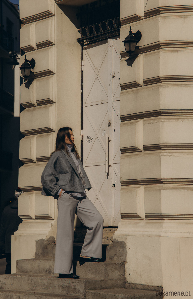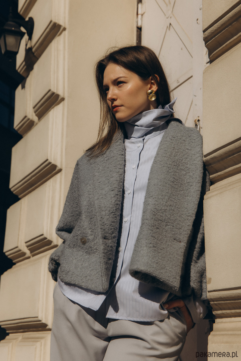 Oversizowy krój kimonowy z szalowym kołnierzem, krótka kurtka zapinana na dwa guziczki, szerokie, proste rękawy u dolu ściągnięte gumka, Dwie naszywane kieszonki z przodu.