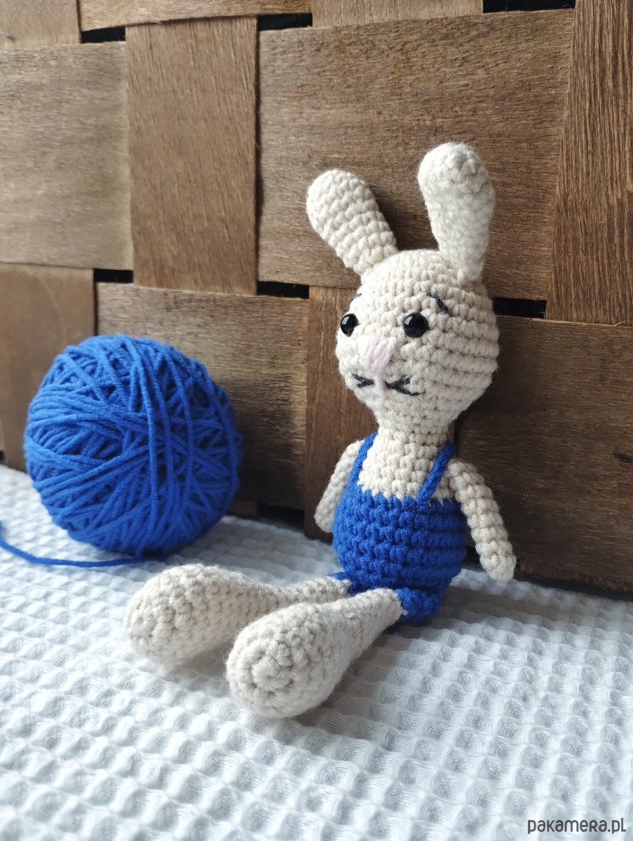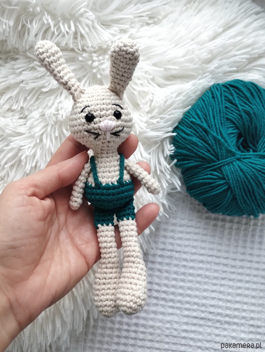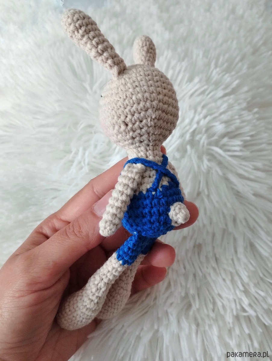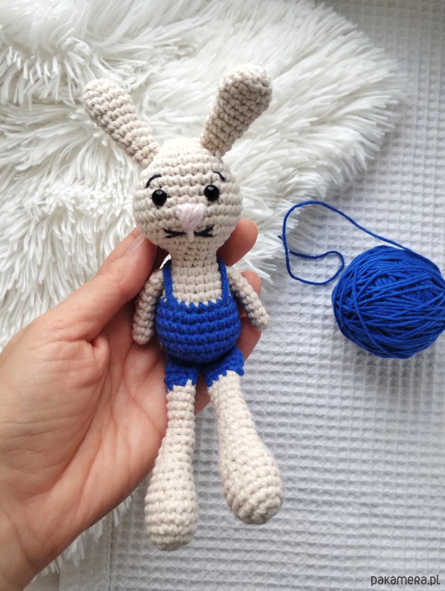 A zabawka to mini króliczek. Mini, bo pochodzi z serii namniejszych dzierganych przeze mnie zabawek. Ma prawie 20 cm wzrostu (razem z uszkami), różowy nosek, długaśne nóżki i uszka - jak na zajączka przystało. Będzie doskonałym towarzyszem każdej zabawy, a biorąc pod uwagę jego kieszonkowy rozmiar będzie mógł wyruszyć na każdą wyprawę!