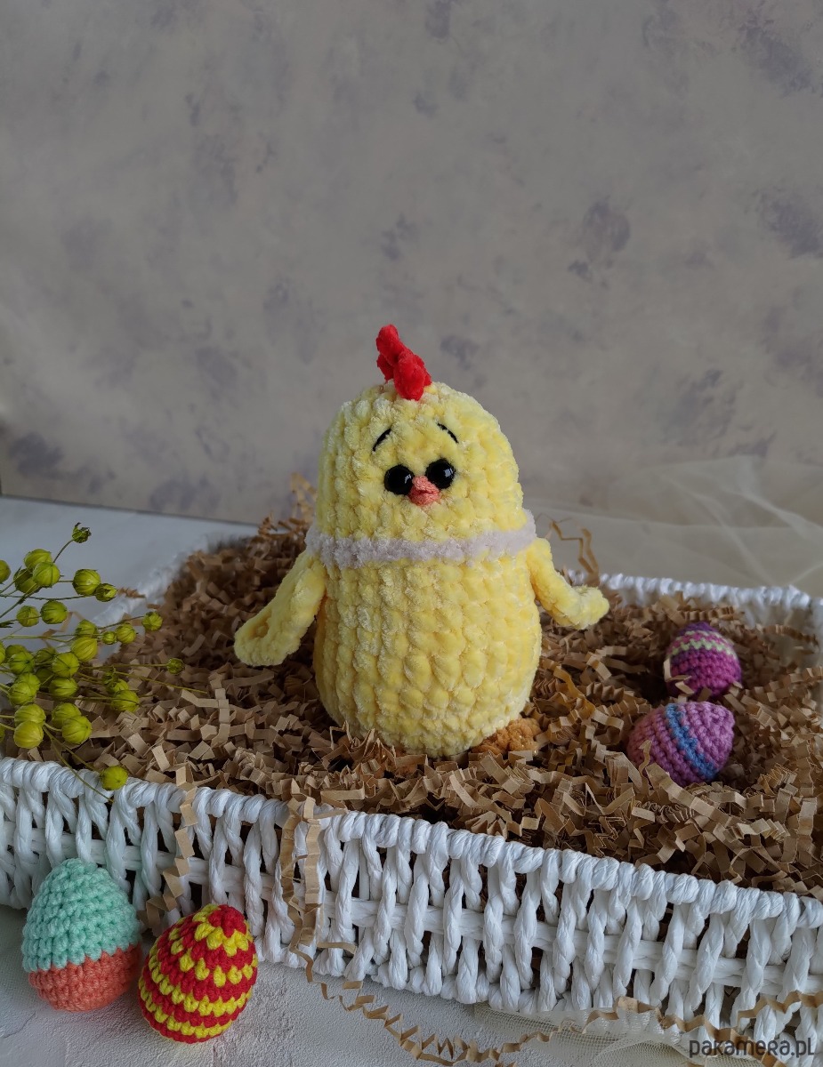 Pluszowa mała kura wykonana z różnej grubości pluszowej włóczki, które posiadają Certyfikat Oeko-Tex.