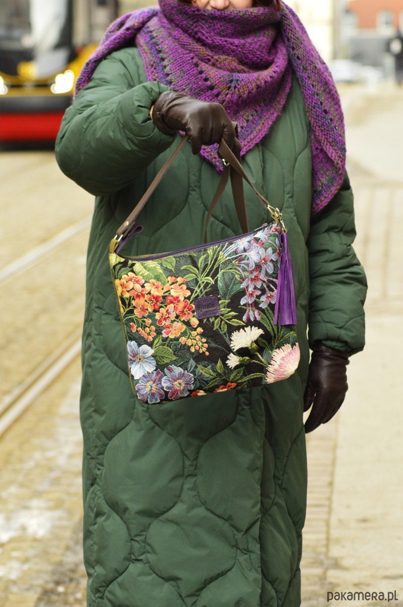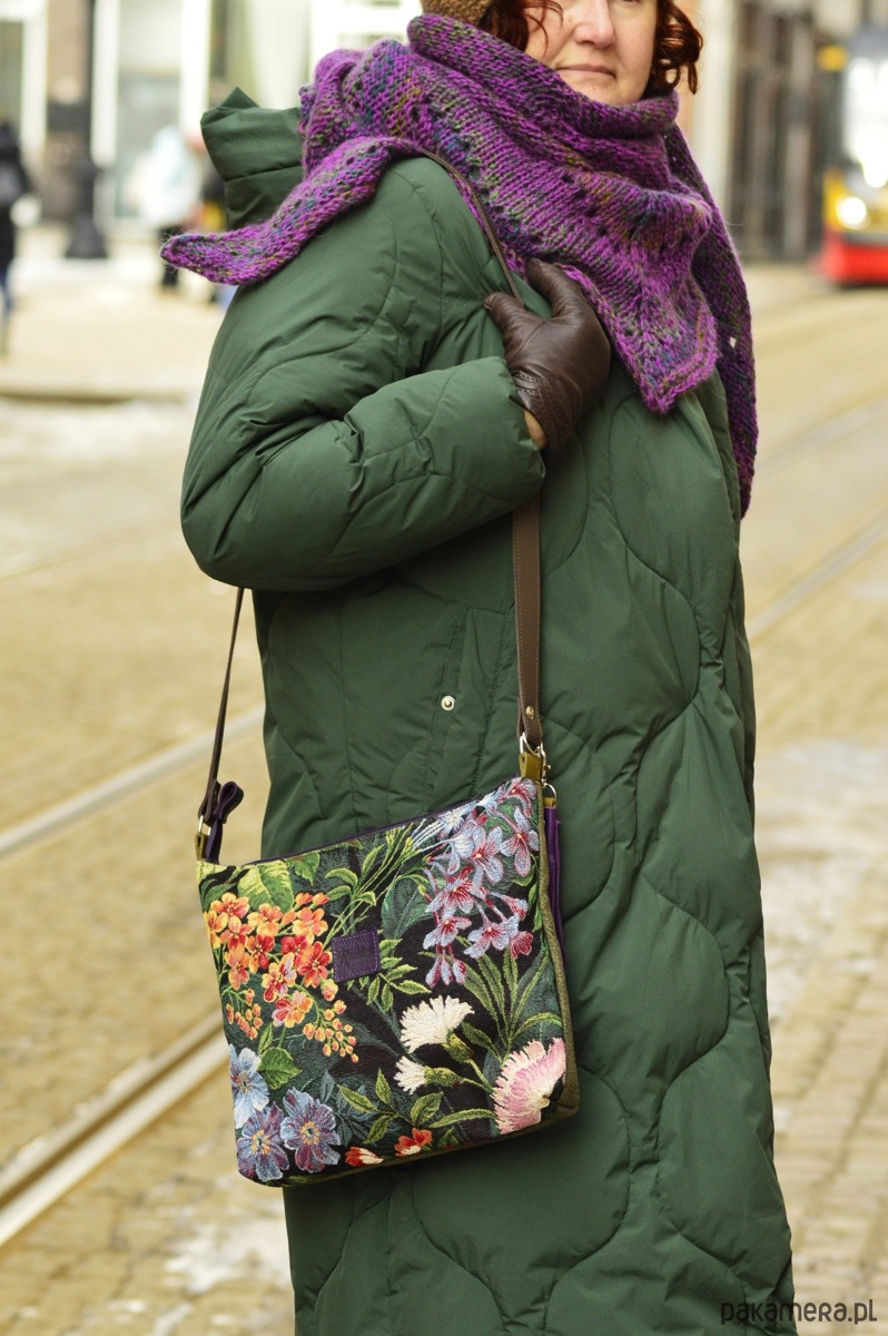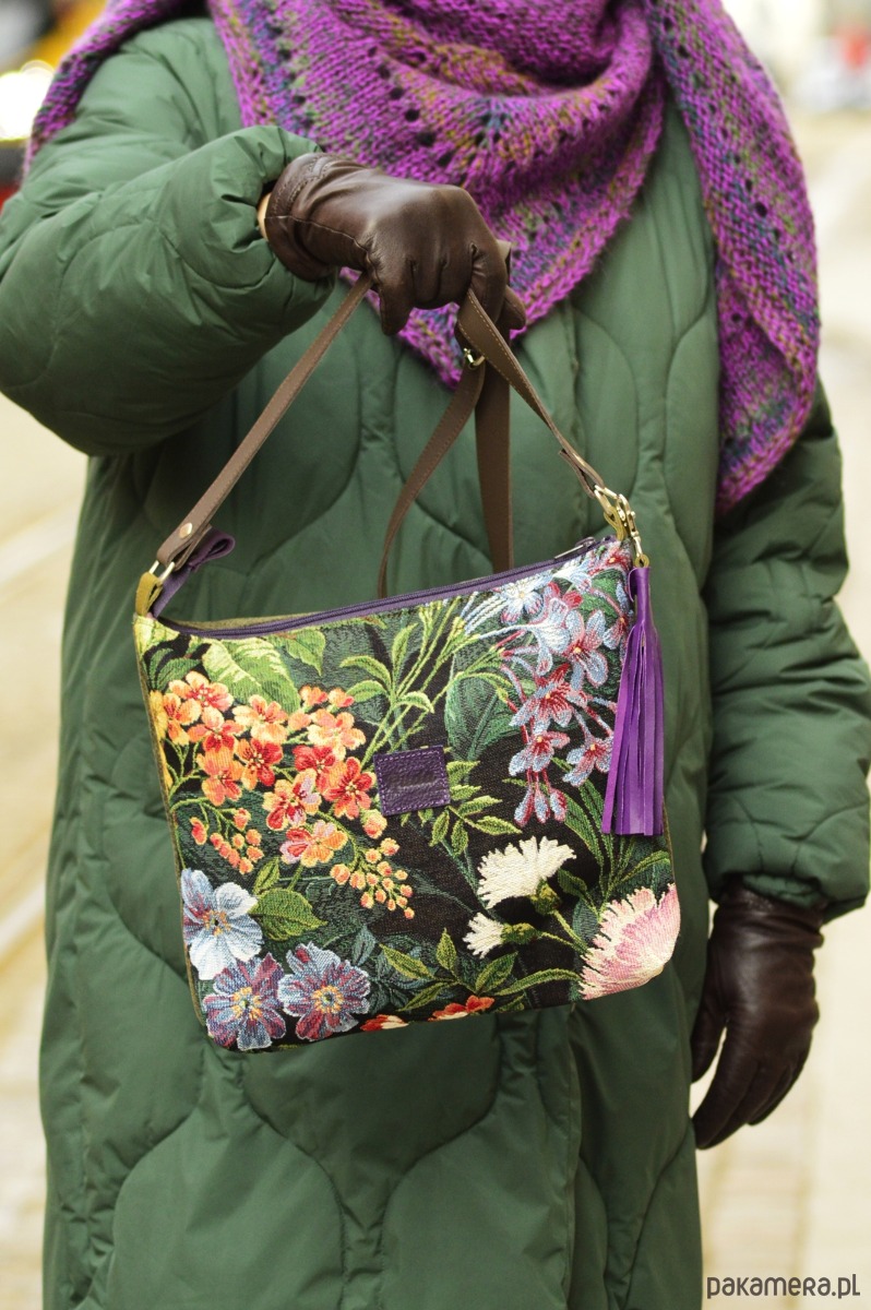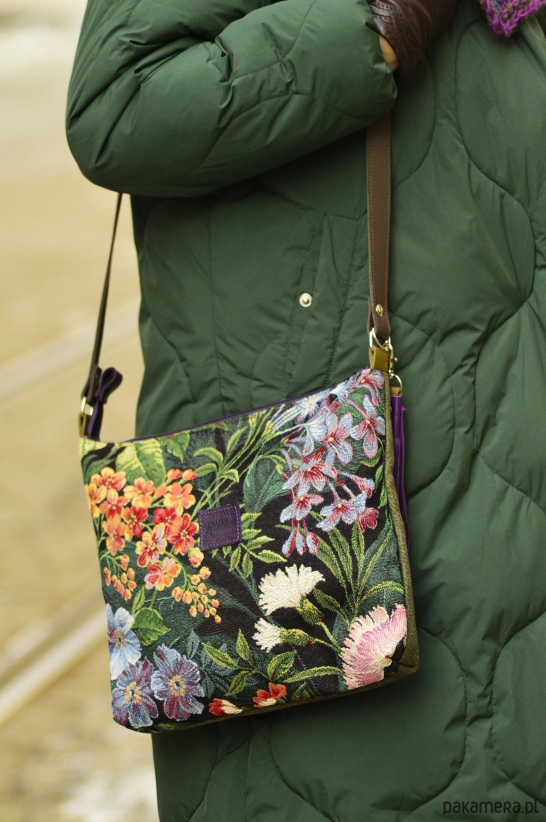 Torebka została wykonana z tkaniny gobelinowej, syntetycznego nubuku oraz skóry naturalnej ( regulowany pasek, łączenia oraz chwost).Całość zapina się na suwak, a wewnątrz znajduje się podszewka z dwiema kieszonkami. Wymiary torebki: ok. 30 x35 cm