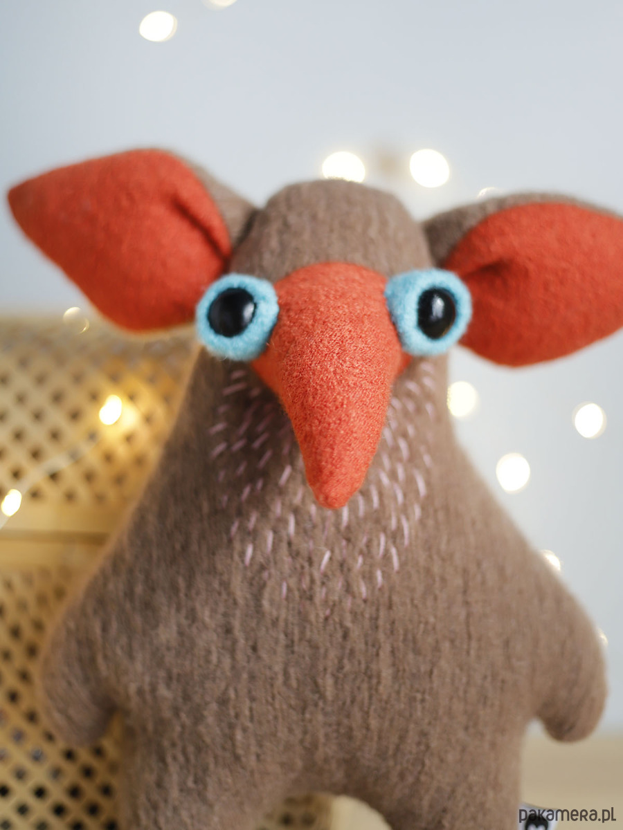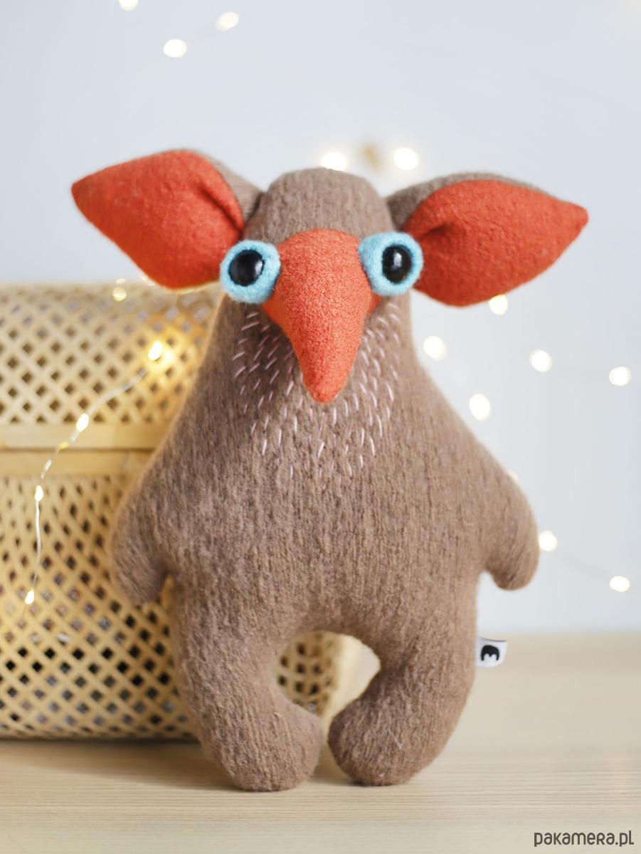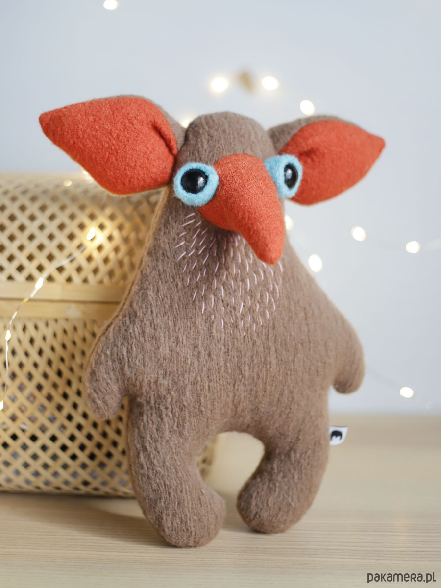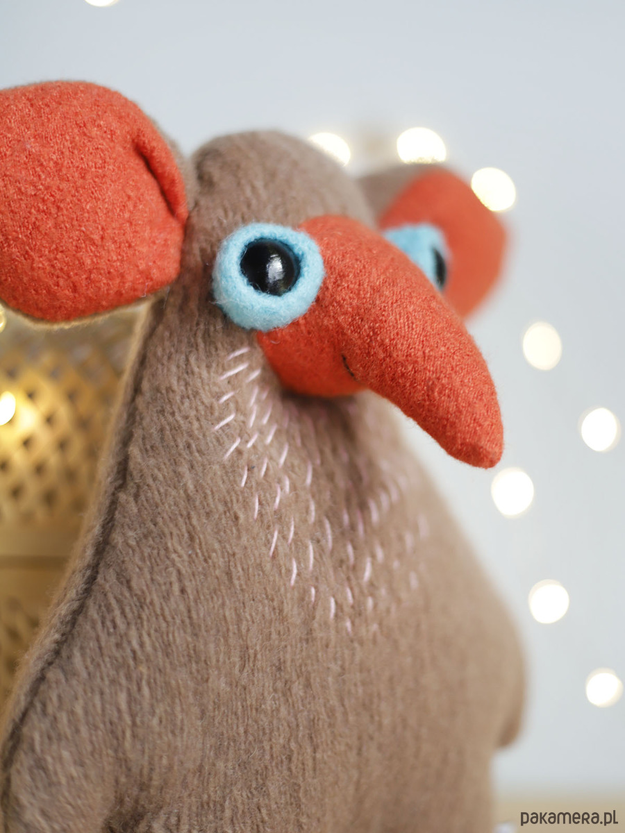 Materiały: uszyty z wełnianej dzianiny, oczy stworzone z malowanego drewna, wypełniony antyalergicznym puchem poliestrowym.