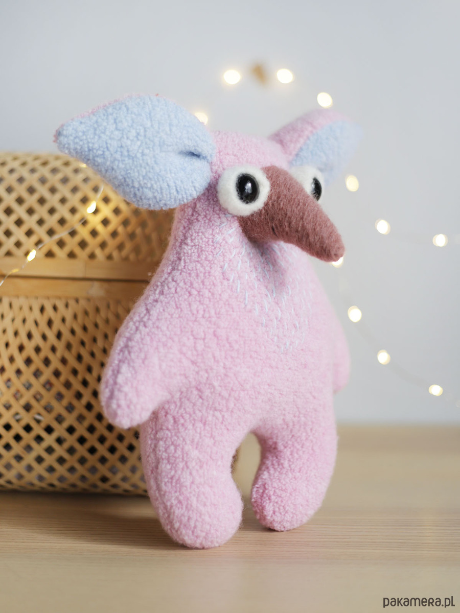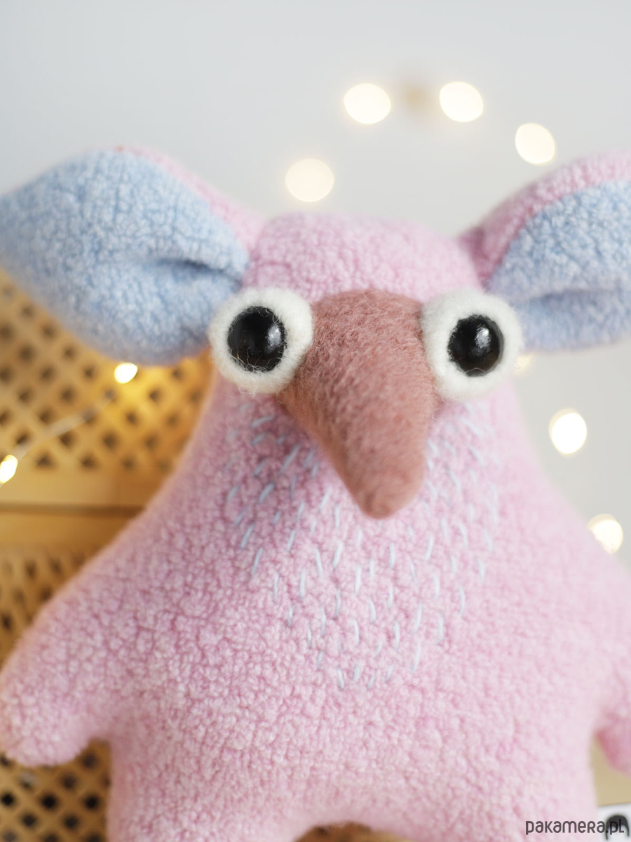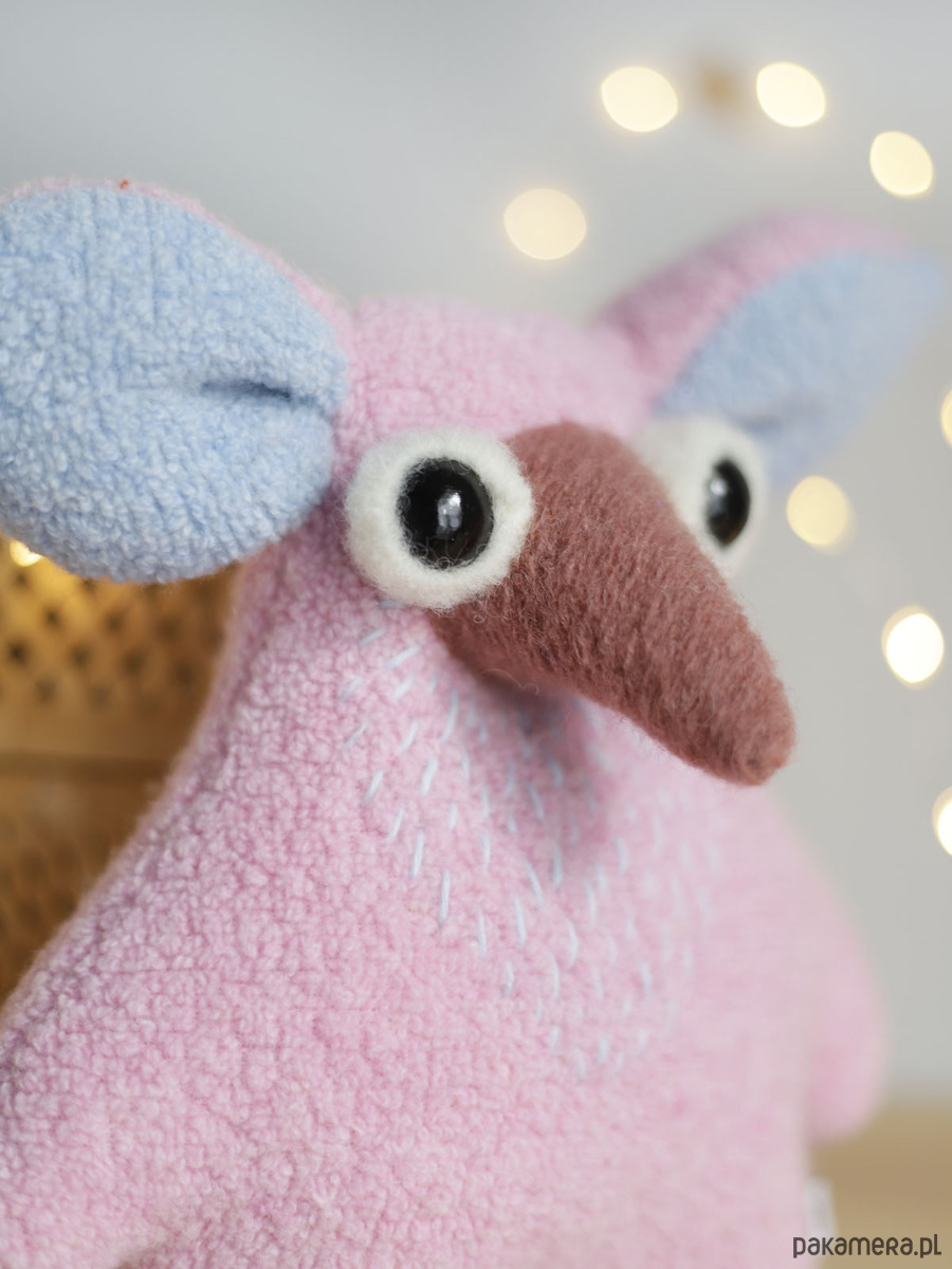 Materiały: uszyty z wełnianej dzianiny, oczy stworzone z malowanego drewna, wypełniony antyalergicznym puchem poliestrowym.