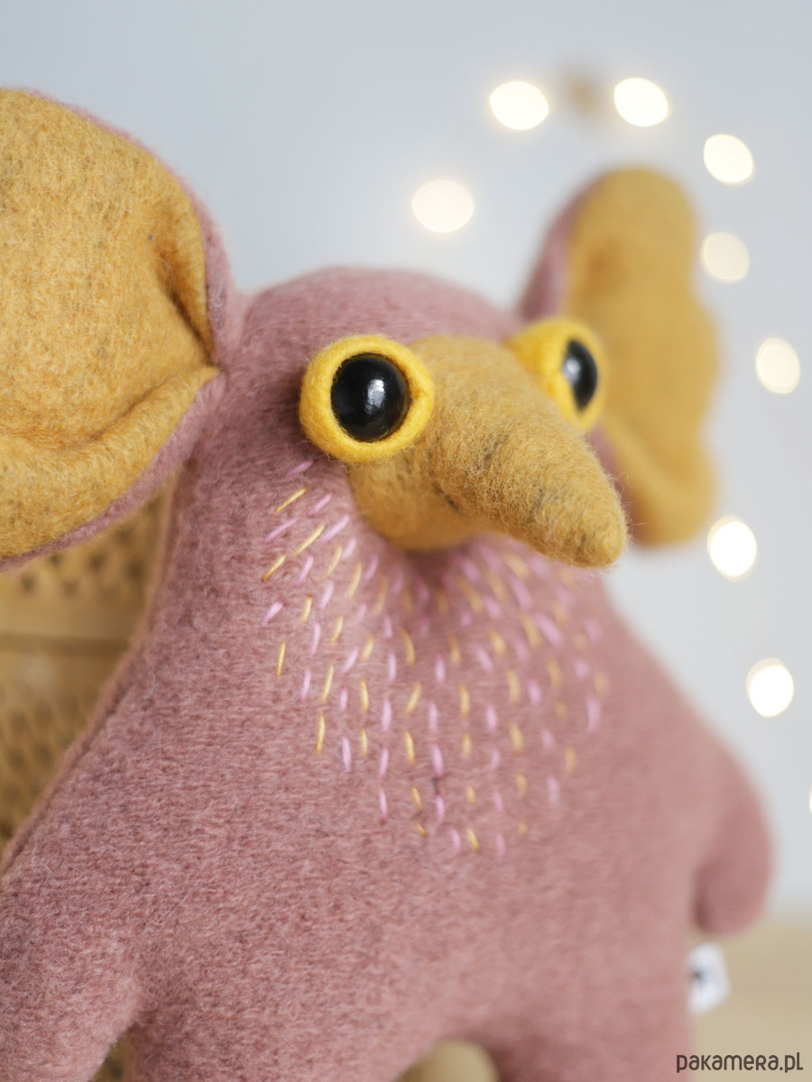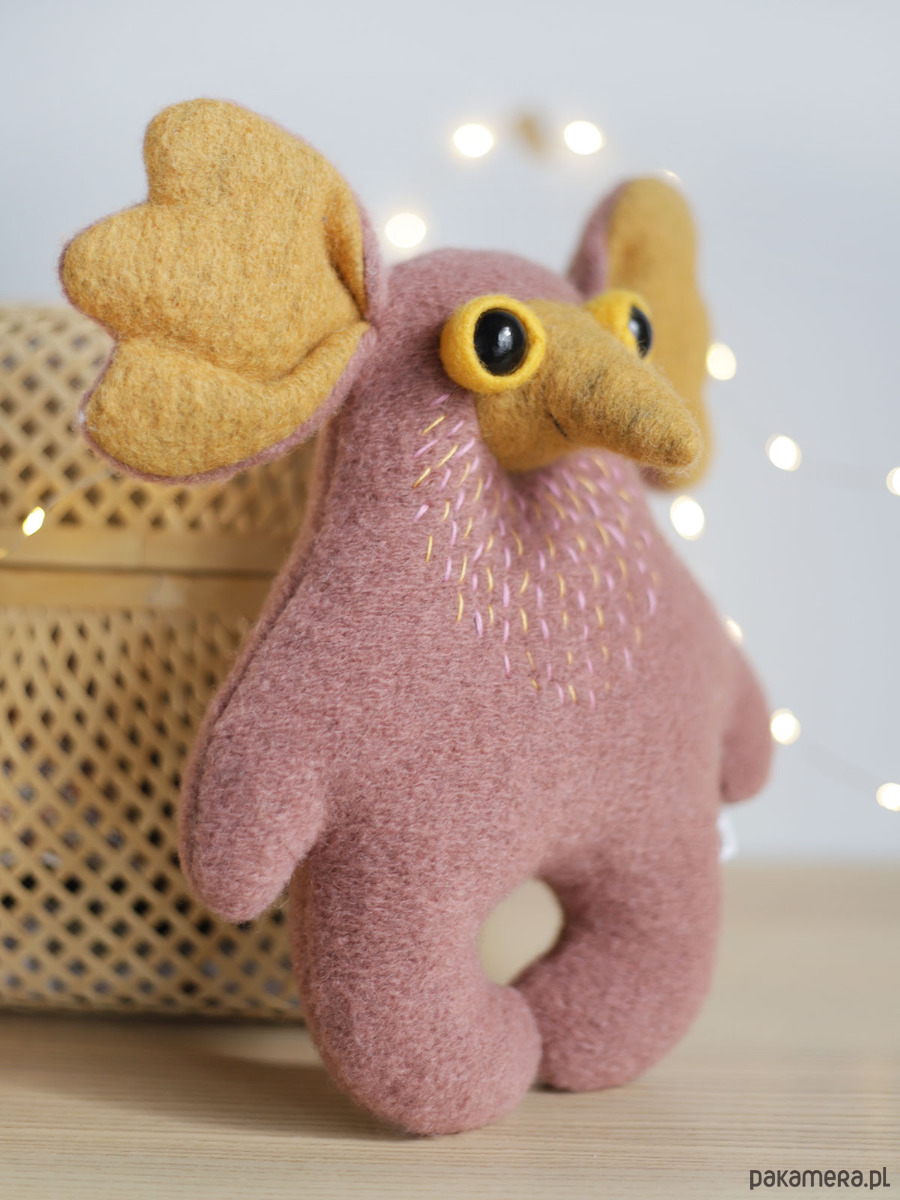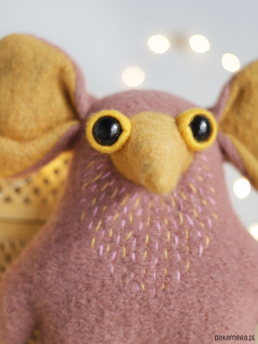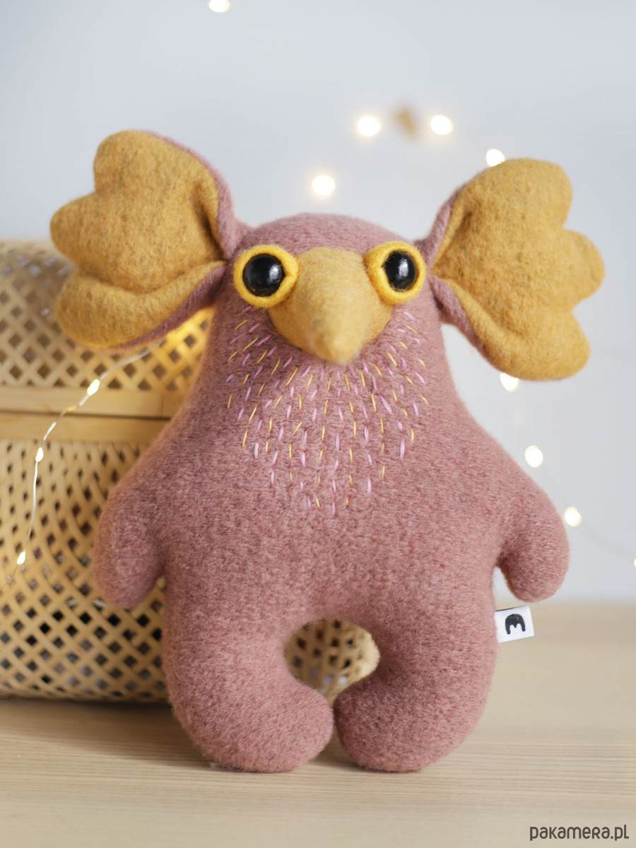 Materiały: uszyty z wełnianej dzianiny, oczy stworzone z malowanego drewna, wypełniony antyalergicznym puchem poliestrowym.