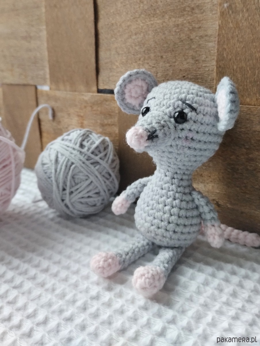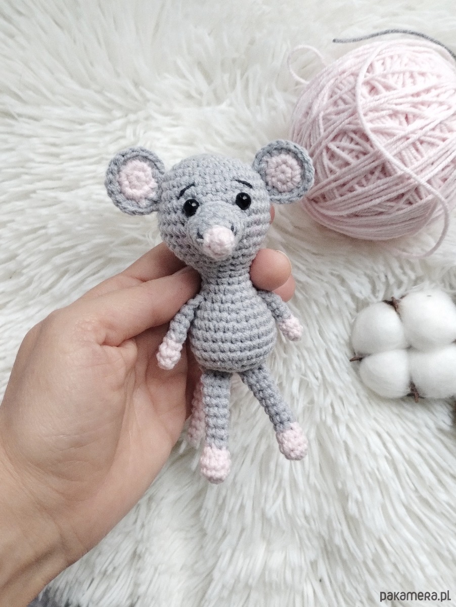 A zabawka to mini myszka. Mini, bo pochodzi z serii namniejszych dzierganych przeze mnie zabawek. Ma ok 13 cm wzrostu, maleńkie uszka, długi, różowy ogonek i szare ciałko - jak na myszkę przystało. Będzie doskonałą towarzyszką każdej zabawy, a biorąc pod uwagę jej kieszonkowy rozmiar będzie mogła wyruszyć na każdą wyprawę!