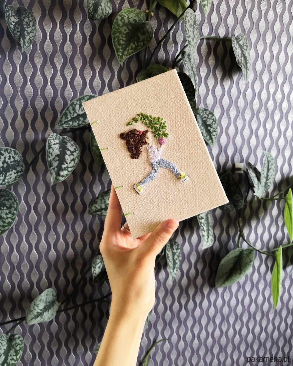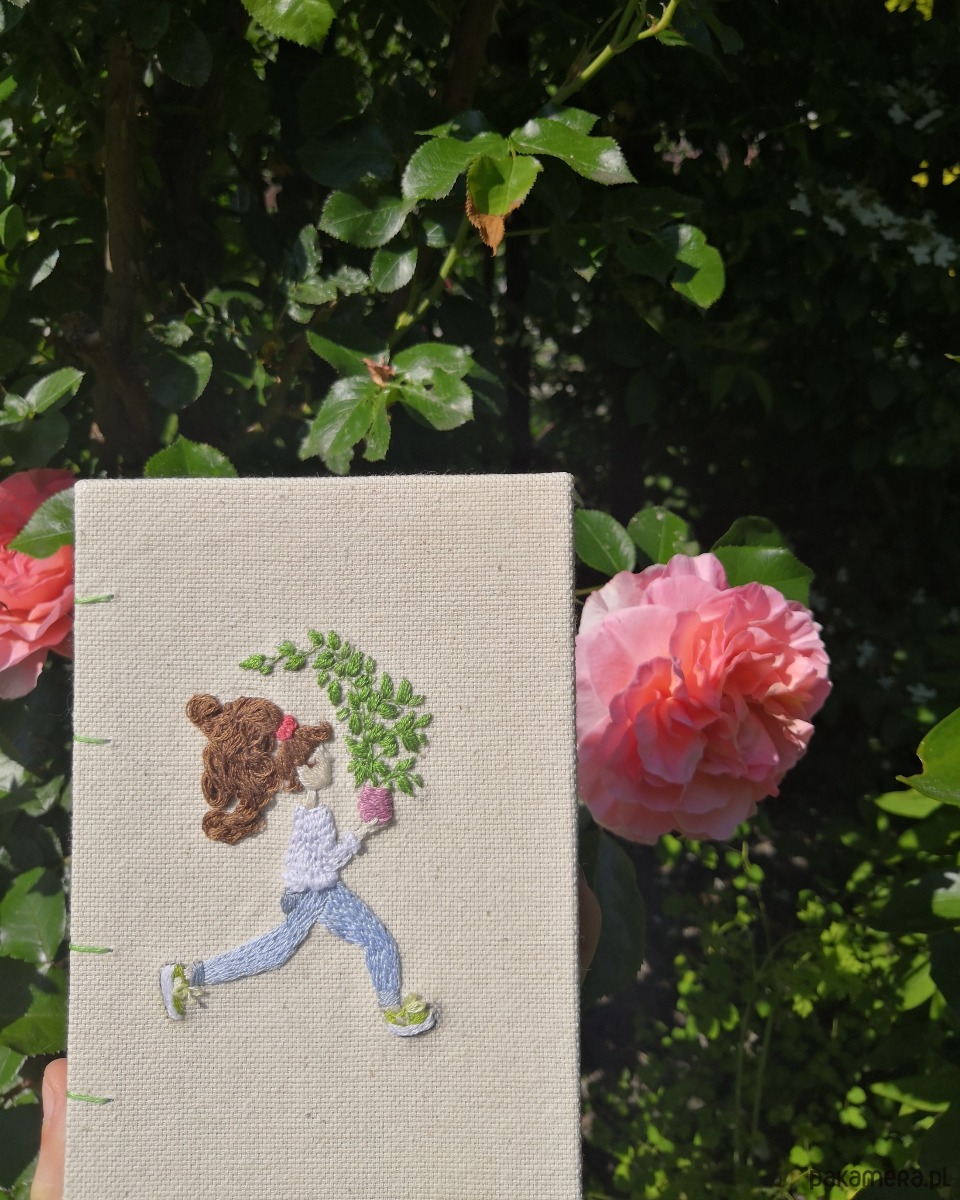 Twarda okładka obłożona bawełnianą tkaniną z wyhaftowaną dziewczyną