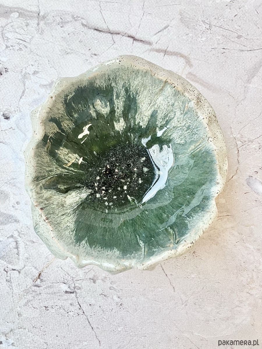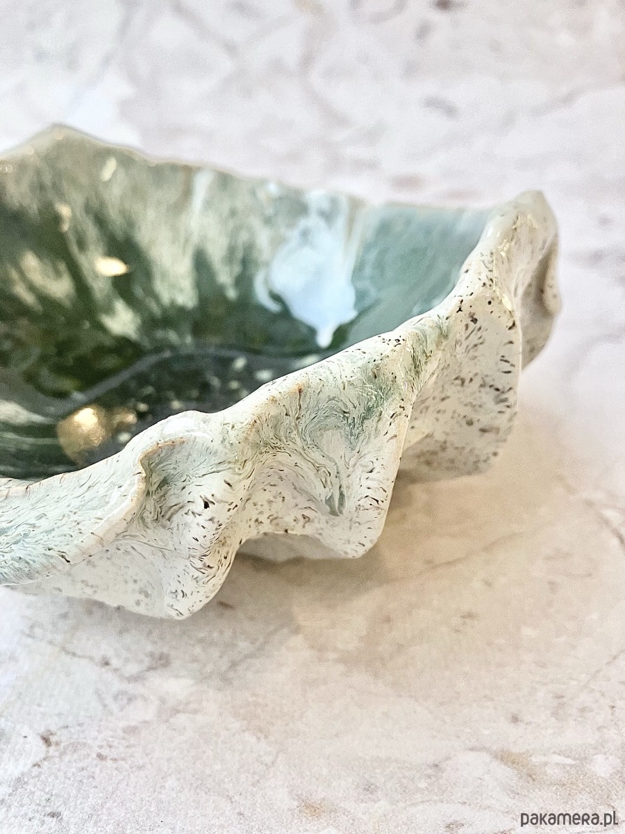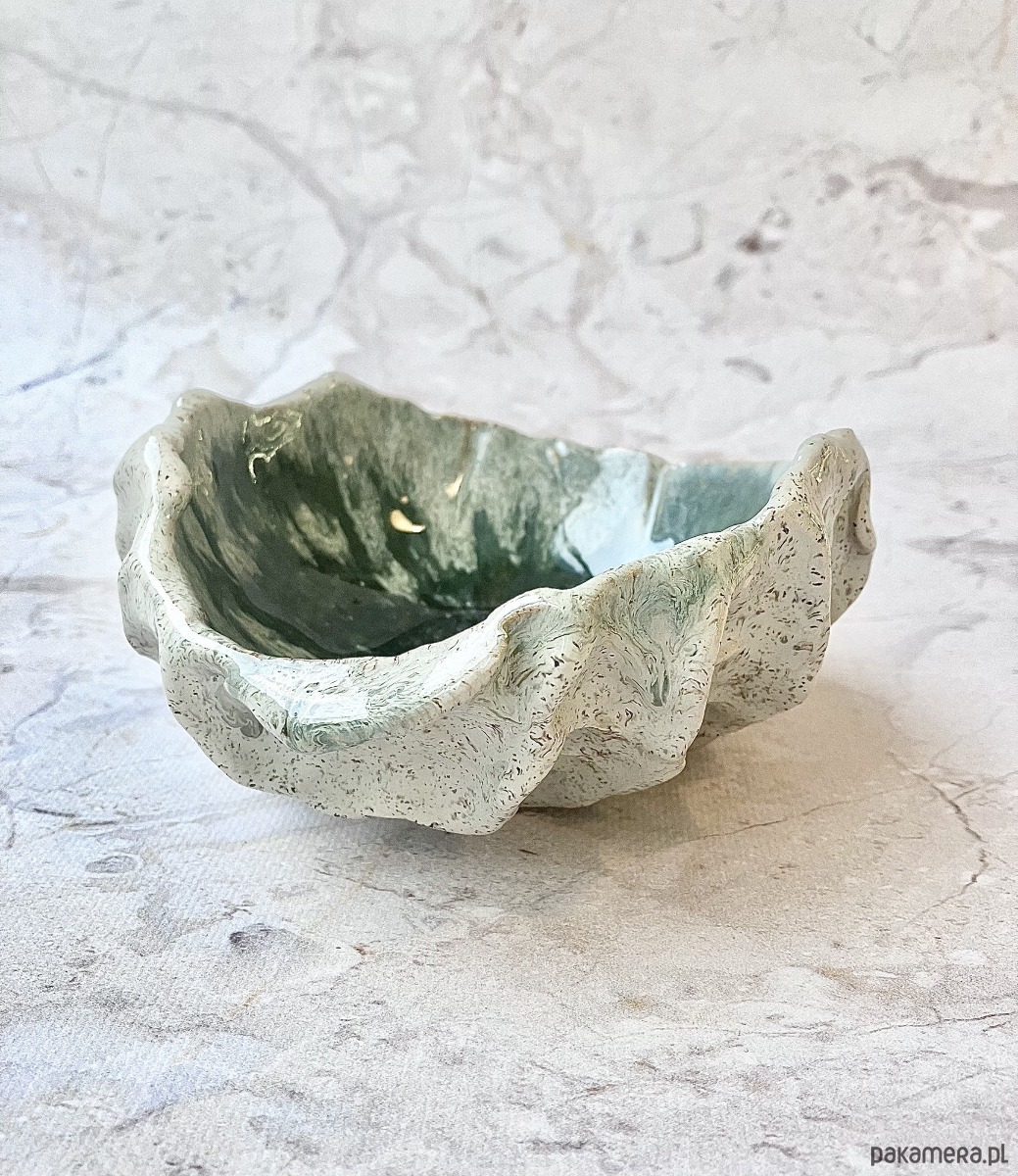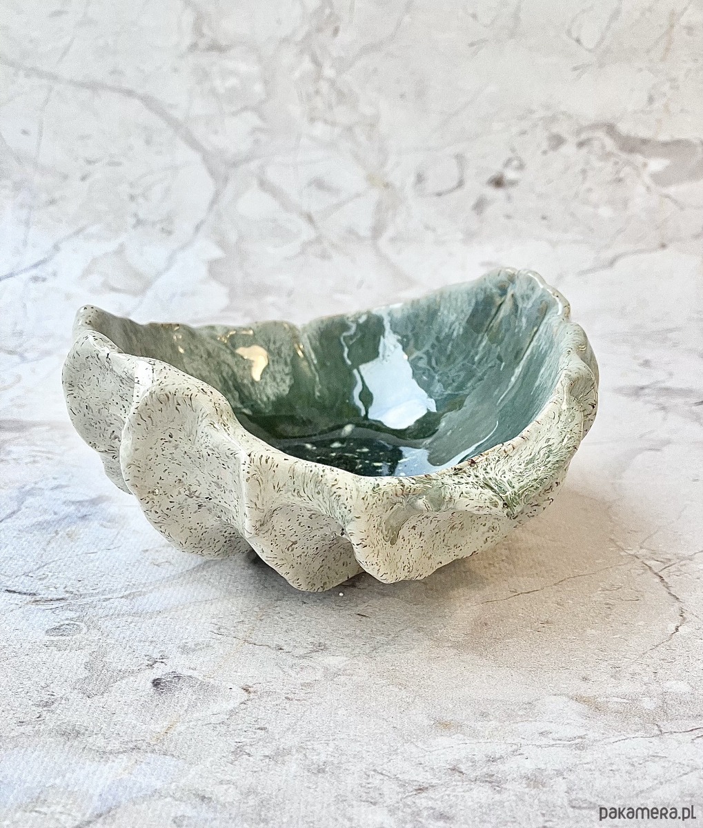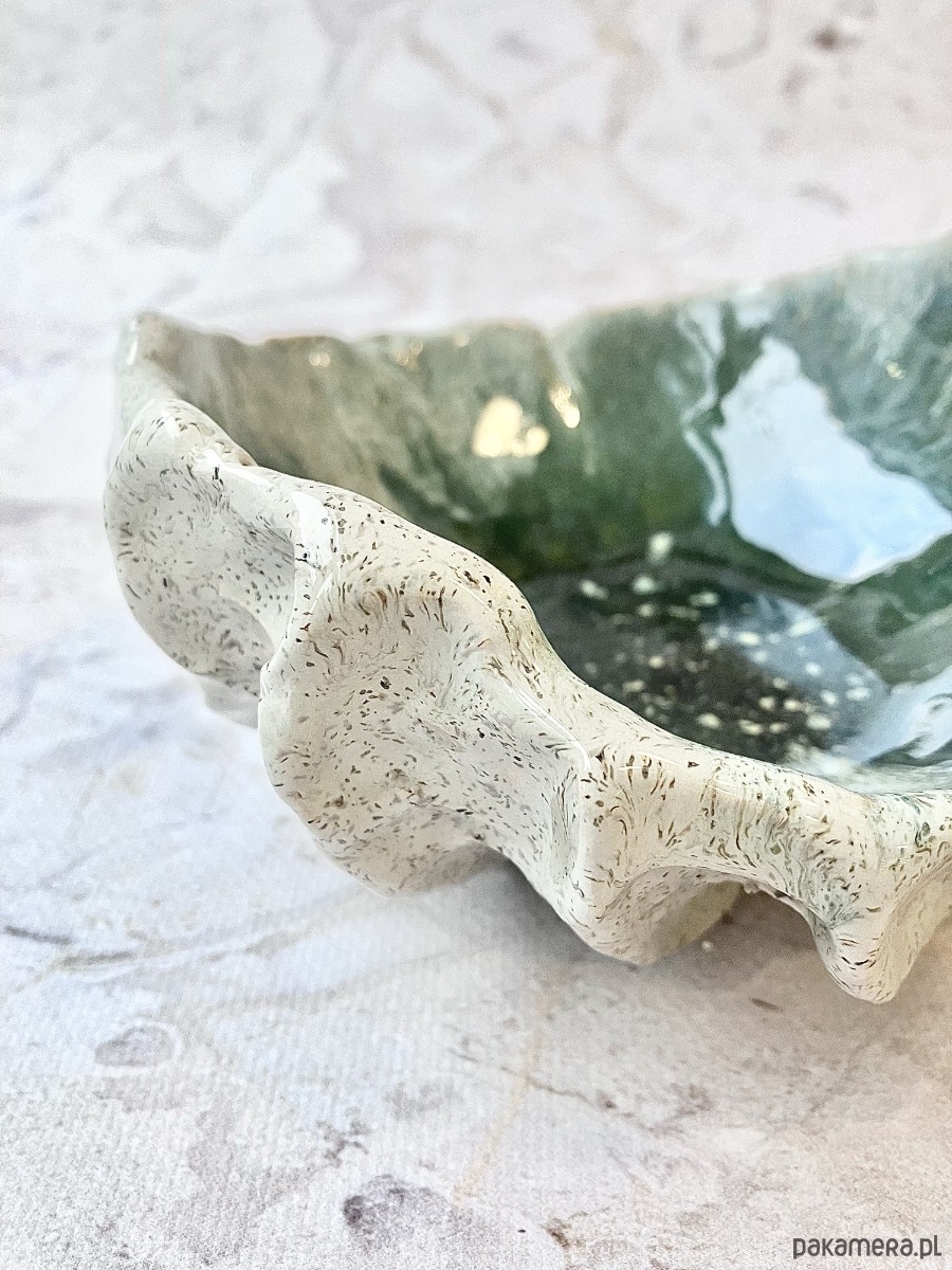 Delikatna, ręcznie formowana mini patera inspirowana naturalnym kształtem muszli. Jej organiczne, nieregularne falowanie brzegów nadaje całości lekkości i unikatowego charakteru. Wnętrze pokryte jest szkliwem w głębokim, leśno-zielonym odcieniu, z subtelnymi, rozmytymi przejściami kolorystycznymi i błyszczącą powierzchnią, która pięknie odbija światło. Zewnętrzna część utrzymana jest w jasnym, kremowym tonie z delikatnym nakrapianiem, przypominającym naturalne struktury minerałów.