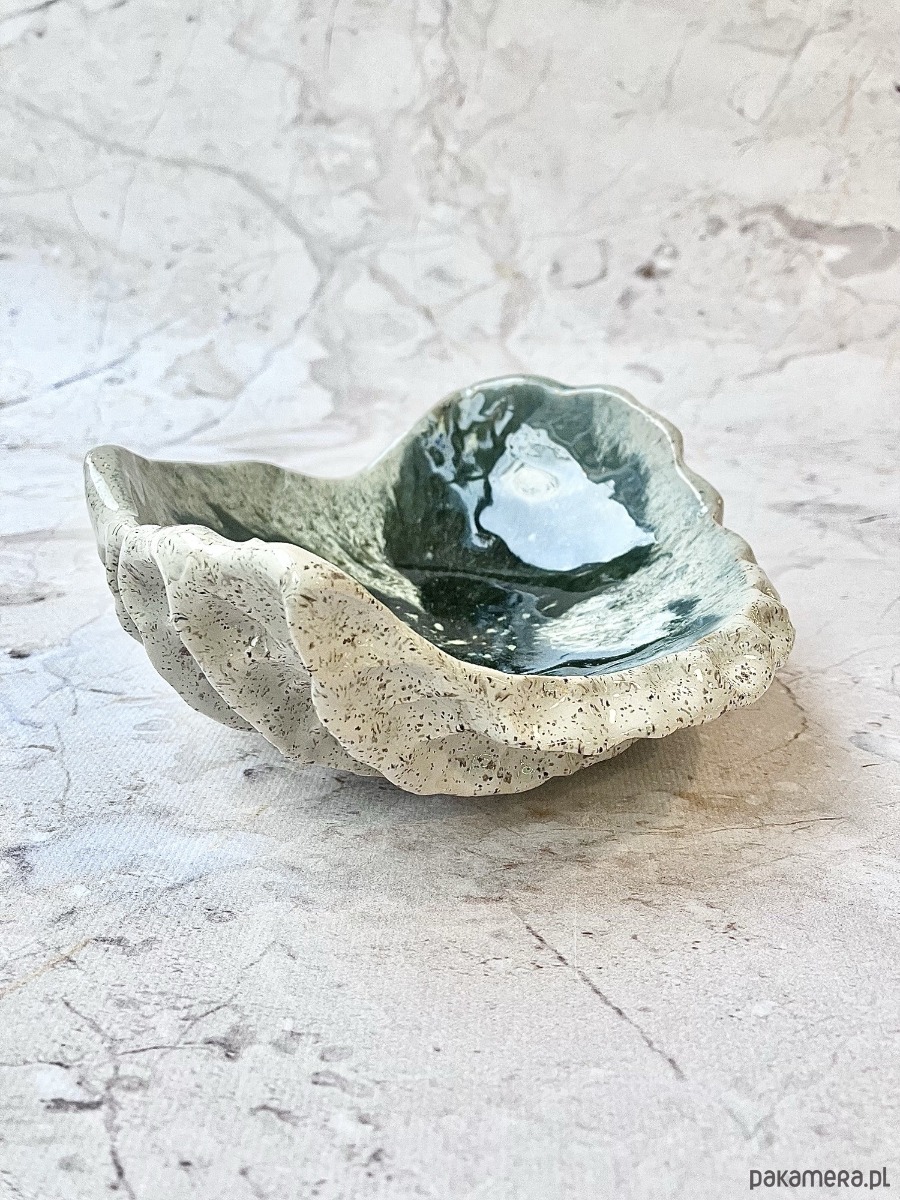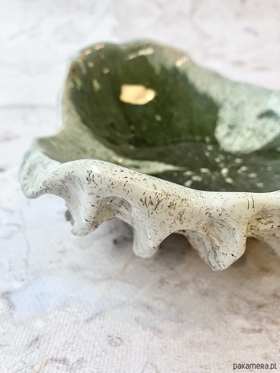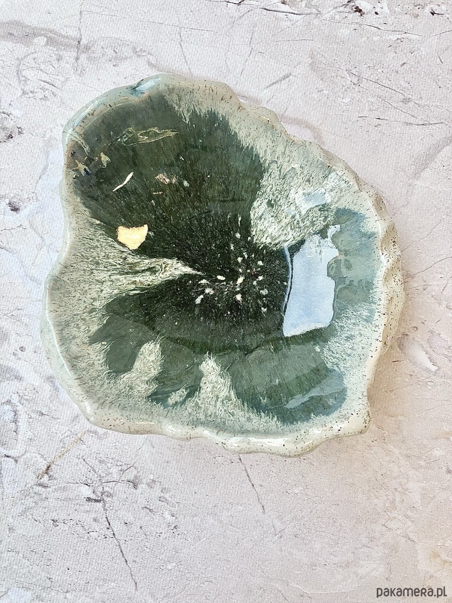 Wnętrze patery zdobi efektowne szkliwienie w głębokiej zieleni, z subtelnymi przejściami kolorów przypominającymi morskie minerały. Delikatne, złociste akcenty dodają całości elegancji i podkreślają wyjątkowość rękodzieła. Zewnętrzna, jasna powierzchnia o nakrapianej strukturze tworzy piękny kontrast z nasyconym wnętrzem.