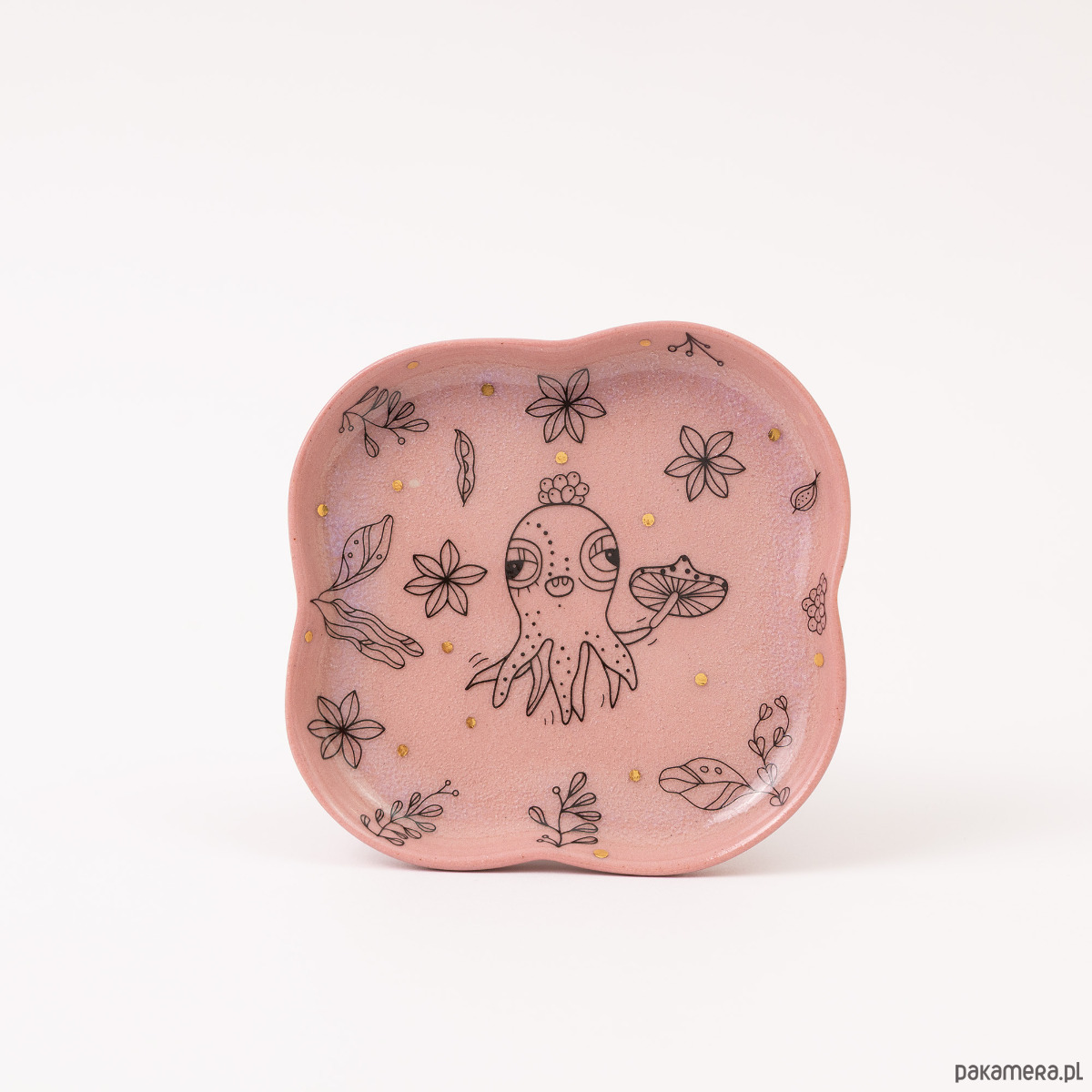 Mini paterka wykonana z kamionki fragmentarycznie poszkliwionej. Wykonana w stu procentach ręcznie. Kolory: różowy kolor gliny + transparent (szkliwo błyszczące) + czarna grafika linearna + złote kropeczki.