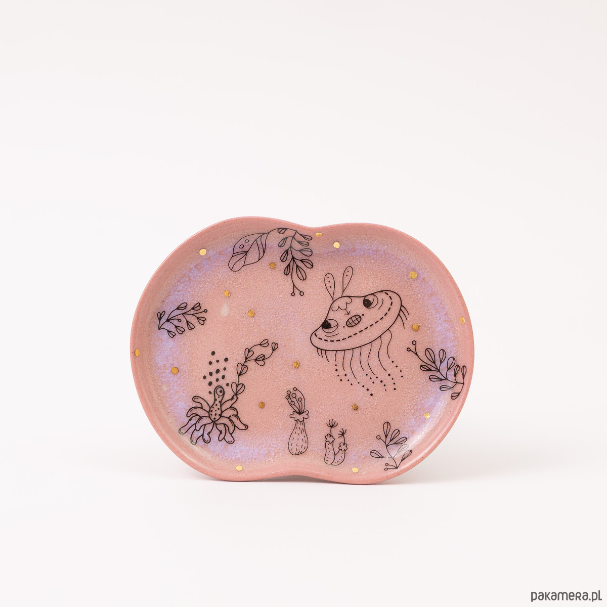 Mini paterka wykonana z kamionki fragmentarycznie poszkliwionej. Wykonana w stu procentach ręcznie. Kolory: różowy kolor gliny + transparent (szkliwo błyszczące) + czarna grafika linearna + złote kropeczki.