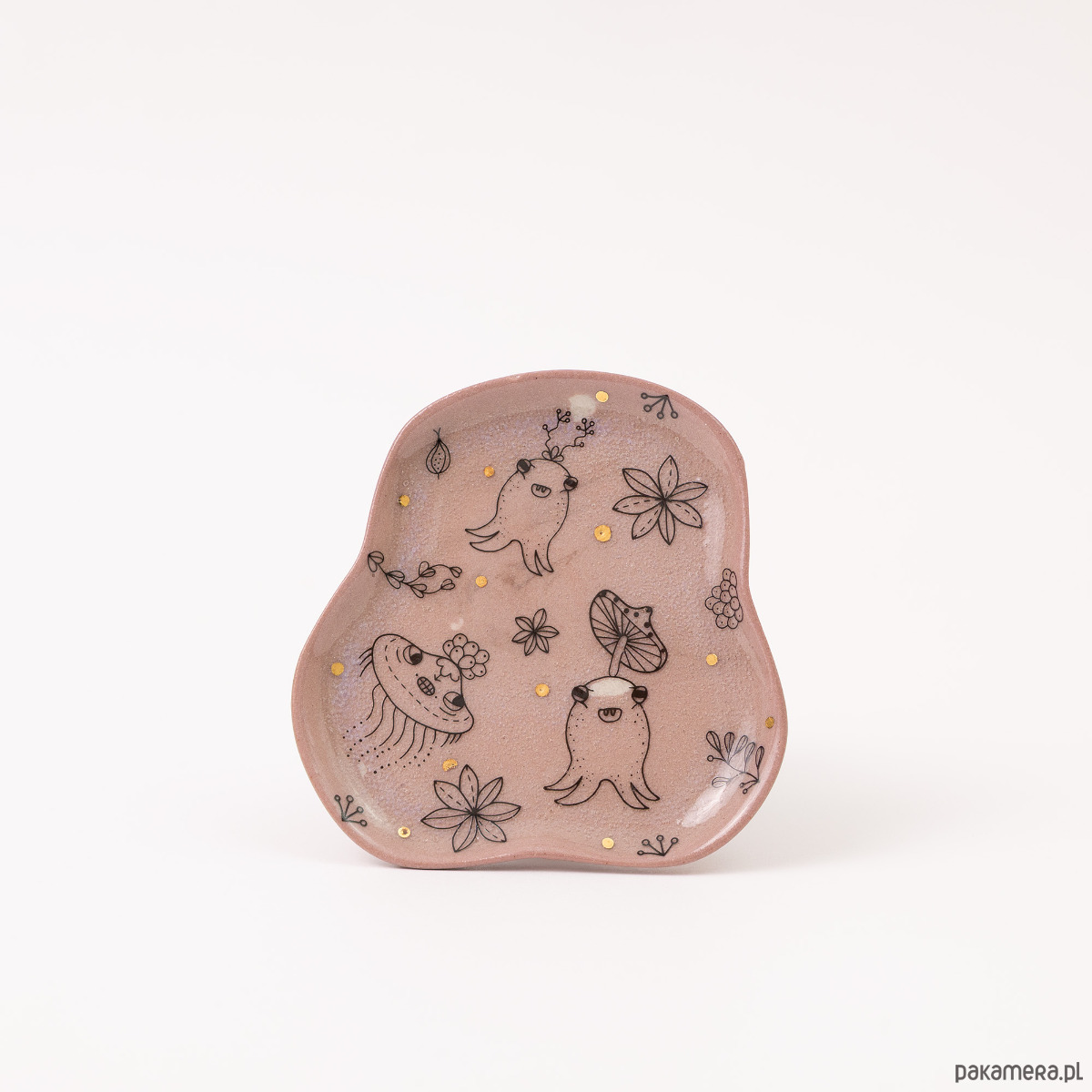 Mini paterka wykonana z kamionki fragmentarycznie poszkliwionej. Wykonana w stu procentach ręcznie. Kolory: szaro różowy kolor gliny + transparent (szkliwo błyszczące) + czarna grafika linearna + złote kropeczki.
